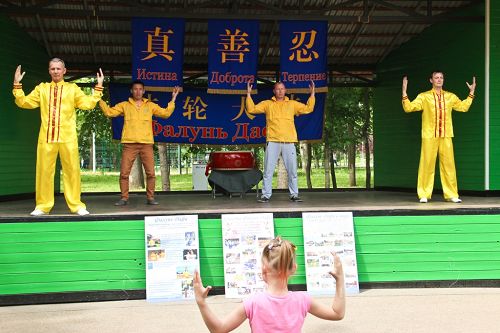 在下诺夫哥罗德(Nizhny Novgorod),法轮功学员在当地的Sormovsky Park向当地民众介绍法轮功,并展示法轮功的五套功法动作。在听到学员们讲述的法轮功学员在中国遭受的迫害后,当地居民签名表示支持法轮功学员反迫害。