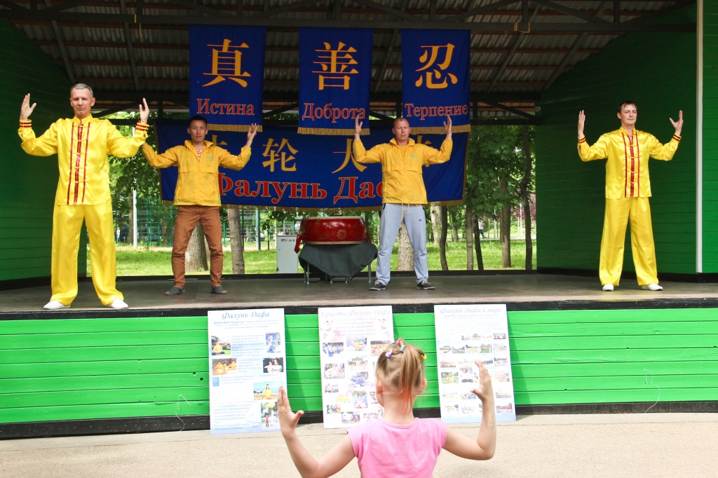 学员们在克拉斯诺达尔(Krasnodar)最受当地人喜爱的城市公园之一的舞台上,法轮功学员向游客介绍法轮功,并展示法轮功的五套功法动作。旁边设有桌椅板凳举办“世界的花瓣”活动,可亲手制作纸莲花。向当地民众讲述法轮功在中共体制下受到的残酷迫害,当地民众纷纷签名支持法轮功学员反迫害。