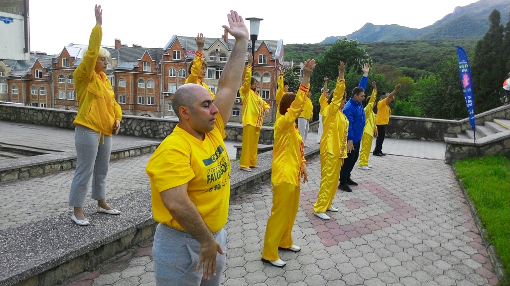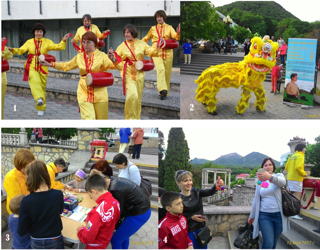 在热列兹诺沃德斯克(Zheleznovodsk),当地的法轮功学员以集体炼功,腰鼓表演、舞狮和举办“世界的花瓣”活动的方式和当地民众同庆这个节日。