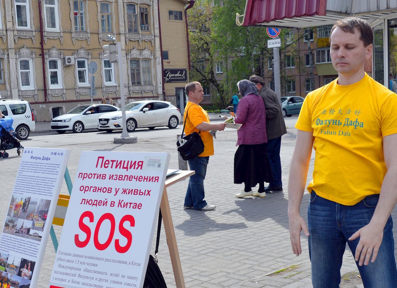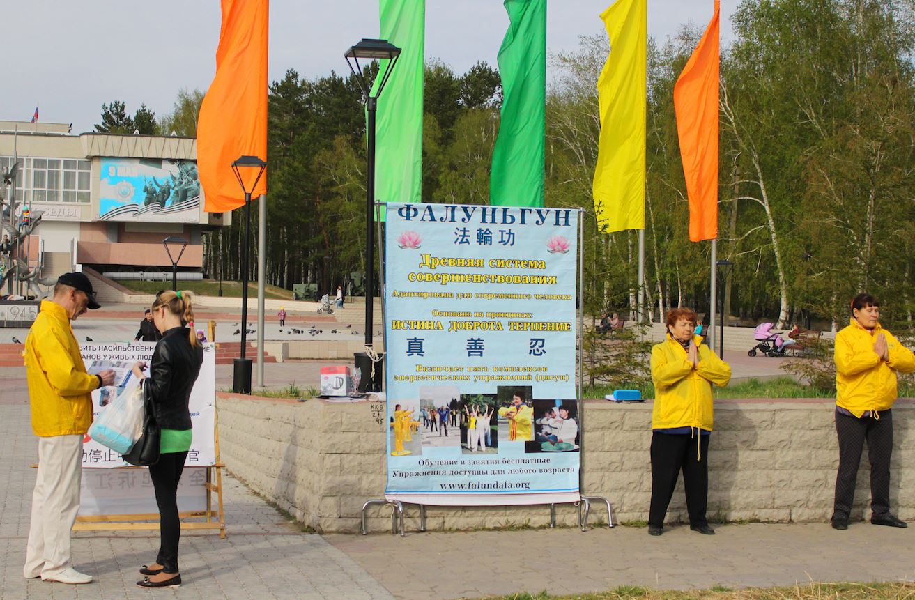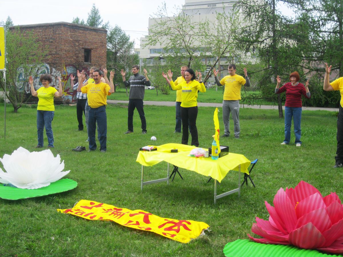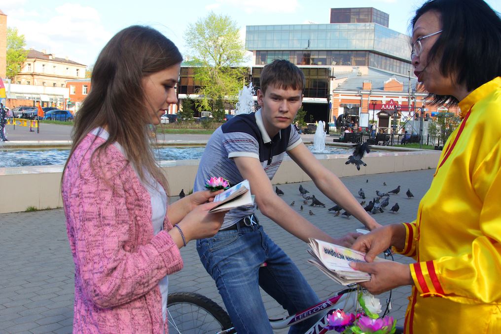 五月十四日,托木斯克大法弟子在大学城举行活动庆祝世界法轮大法日。学员们散发传单,征集签名,演示功法。许多民众毫不犹豫的签名反对活摘法轮功学员器官。一名年长妇女说:“我做了一辈子的医生并以此感到骄傲,可是现在这世界上发生什么事情啊?活摘器官,太可怕了!”两名准备过马路的大学生也签名反对活摘法轮功学员器官并祝愿活动取得成功。