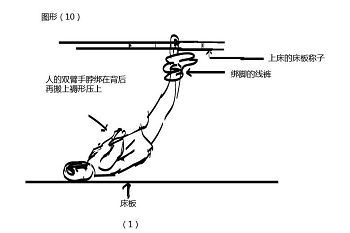 二零一一年的八月立秋之后,因气温越来越低,包夹人在前段时间(四个来月)里采用的“捂闷压”的酷刑不用了,变成了绑吊压的酷刑,如图10,这种“绑吊压” 的酷刑,首先是把人按趴在光光的床板上,一般都是三个人上来一起动手,通常是两个包夹和一个帮教,按着把我的双手,把手脖绑在身体的后背上,再用线裤的两个腿分别绑在我的两个脚脖上。绑好这头再把线裤的另一端从上床的床称上串过来,用力一拉一拽,把我的腿和腹部胸部都不同程度的提起来了。此时也只有人的脸能挨着床板时,就系好上边,接着搬来沉重的褥子压在我后腰上,此时立刻疼痛难忍,惨痛的叫声出来,又立刻被捂、闷上鼻子和嘴,反反复复的捂、闷使声音发不出去,同时强制人说诬陷大法和师父的话。此酷刑的主谋是姜凤英,还有积极配合者韩丽丽、帮教俞雪微。