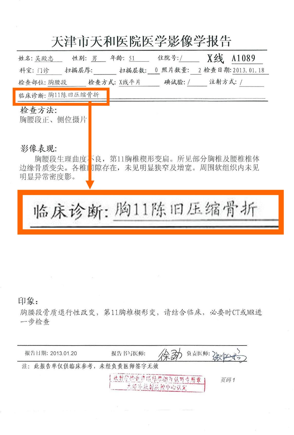 回家后到了天津市天和医院做检查,医学影像学报告证实:吴殿忠的脊椎胸腰段曲度不良,第11胸椎楔形变扁。临床诊断结果:胸11椎陈旧压缩骨折(这是监狱包夹强行按压头部所致);腰椎间盘突出和骨质增生、腰椎退行性病变(这是监狱包夹用膝盖用力撞击腰部所致)。当时医生说:“只有很强的外力撞压才能导致这样的骨折。”