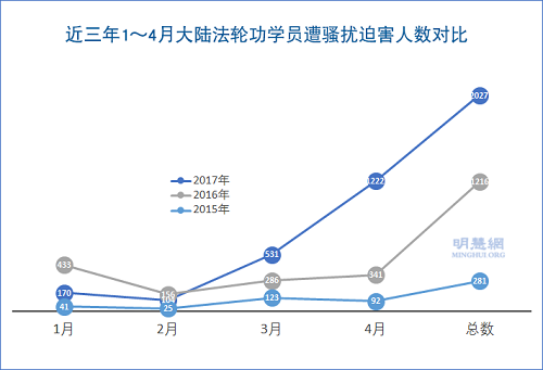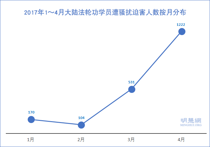 2017年,前三个月骚扰情况一般,唯独4月份明显增至1222人次,说明江泽民残余势力做垂死挣扎,又加大对法轮功学员的迫害力度。