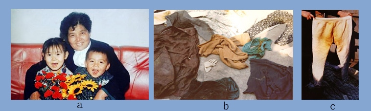 a、陈子秀生前和两个孙儿合照,b、被恶徒丢弃在院落浸透着血渍的陈子秀的全部衣物。陈子秀亲属们在悲愤中摄下的,c、内衬裤上的血渍与泄出污物痕渍