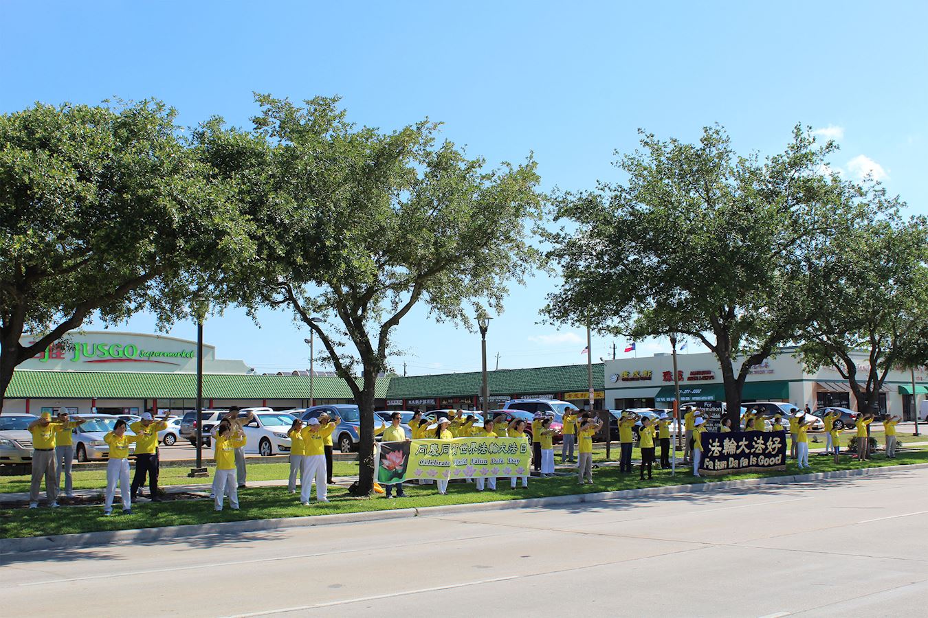 上午十点,学员在中国城百利大道(Bellaire Blvd)旁草坪举行炼功活动,将法轮功的美好传递给当地的华人。学员展示横幅“庆祝世界法轮大法日”、“法轮大法好”。随着炼功音乐,展示法轮功功功法,成为中国城独特的风景线。炼功旁边有中式超市,还有很多商家,又恰逢周末,很快,吸引了当地的华人,也包括从中国来旅游的华人。