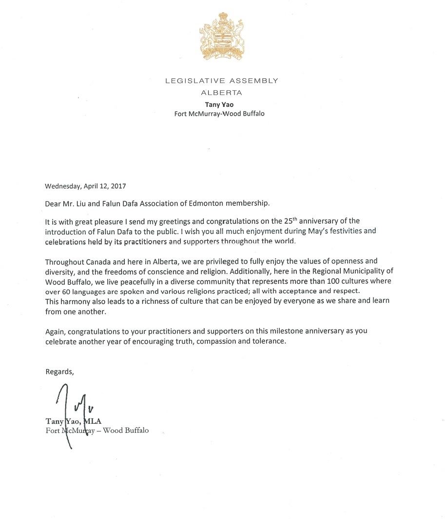 埃德蒙顿法轮大法学会收到了来自三级政府官员的十一封贺信与褒奖,预祝法轮大法学员五月的庆祝活动圆满成功,赞美法轮大法所倡导的真、善、忍原则给社区和世界人民带来的和平与贡献,谴责发生在中国的对法轮功学员的残酷迫害,并表达了支持法轮功学员的和平抗争,捍卫宗教自由与基本人权的愿望。