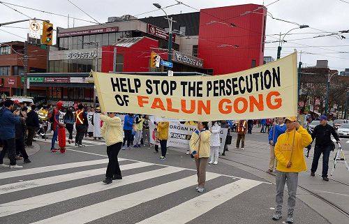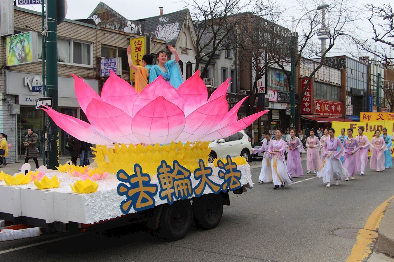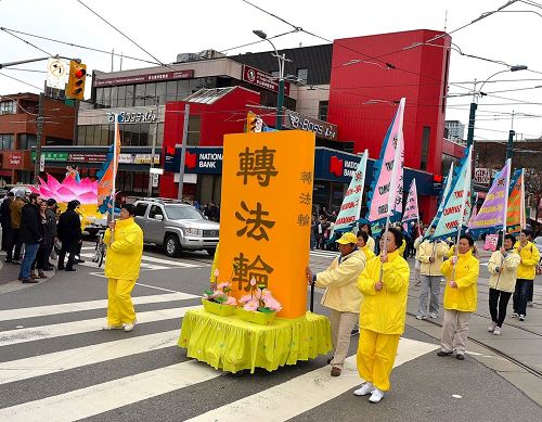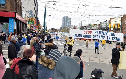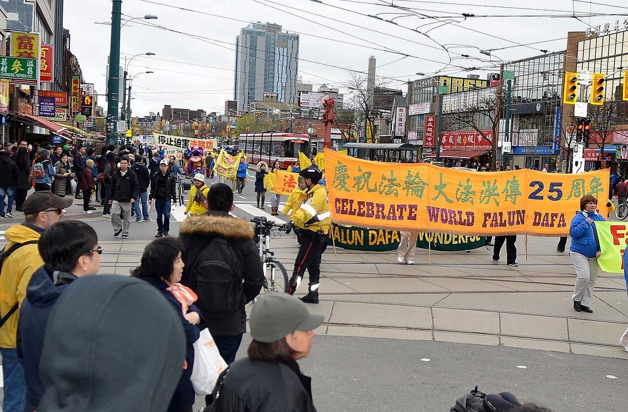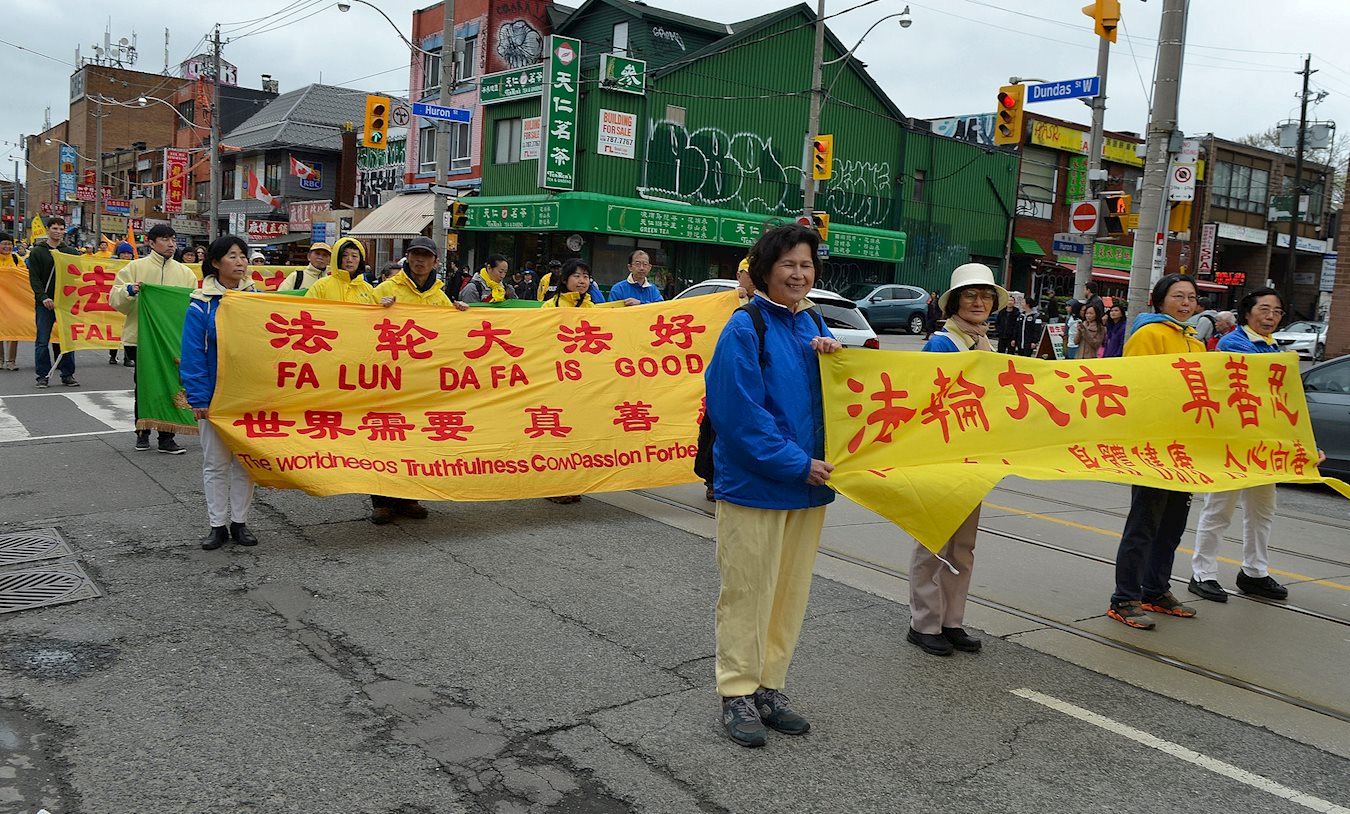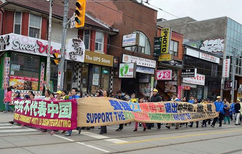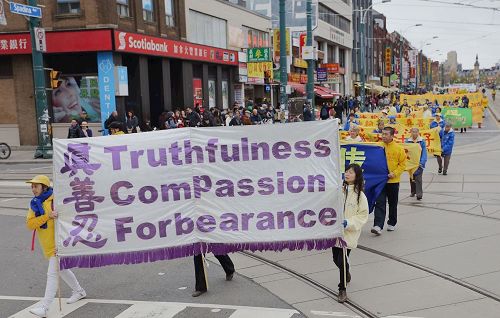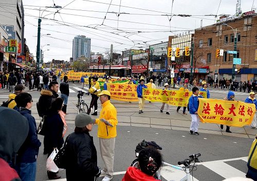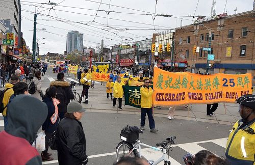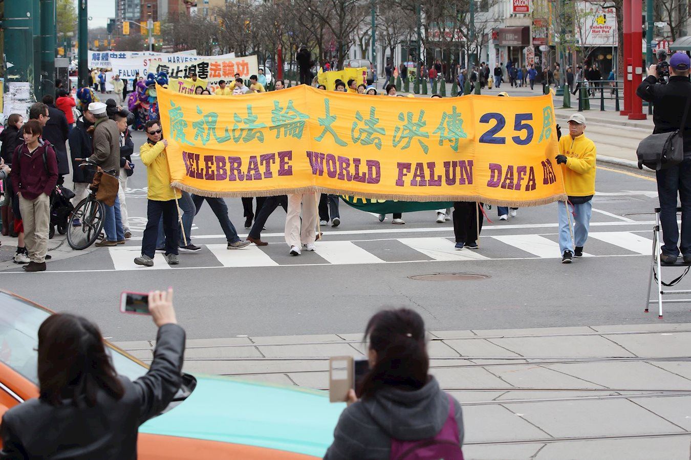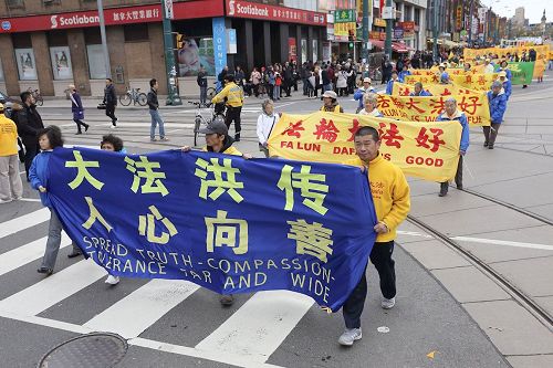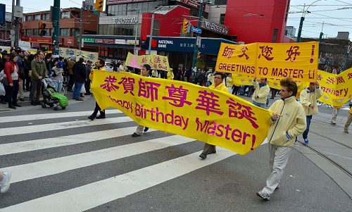 在游行出发前,拍了集体照和录像,恭祝李洪志师父生日快乐!中午12点40分开始游行,游行绕着多伦多市中心经过唐人街两次,最后回到起点。沿途得到市民的欢迎和支持,有了解法轮功真相的西人表示敬佩和支持;有了解真相后的华人做了“三退”。