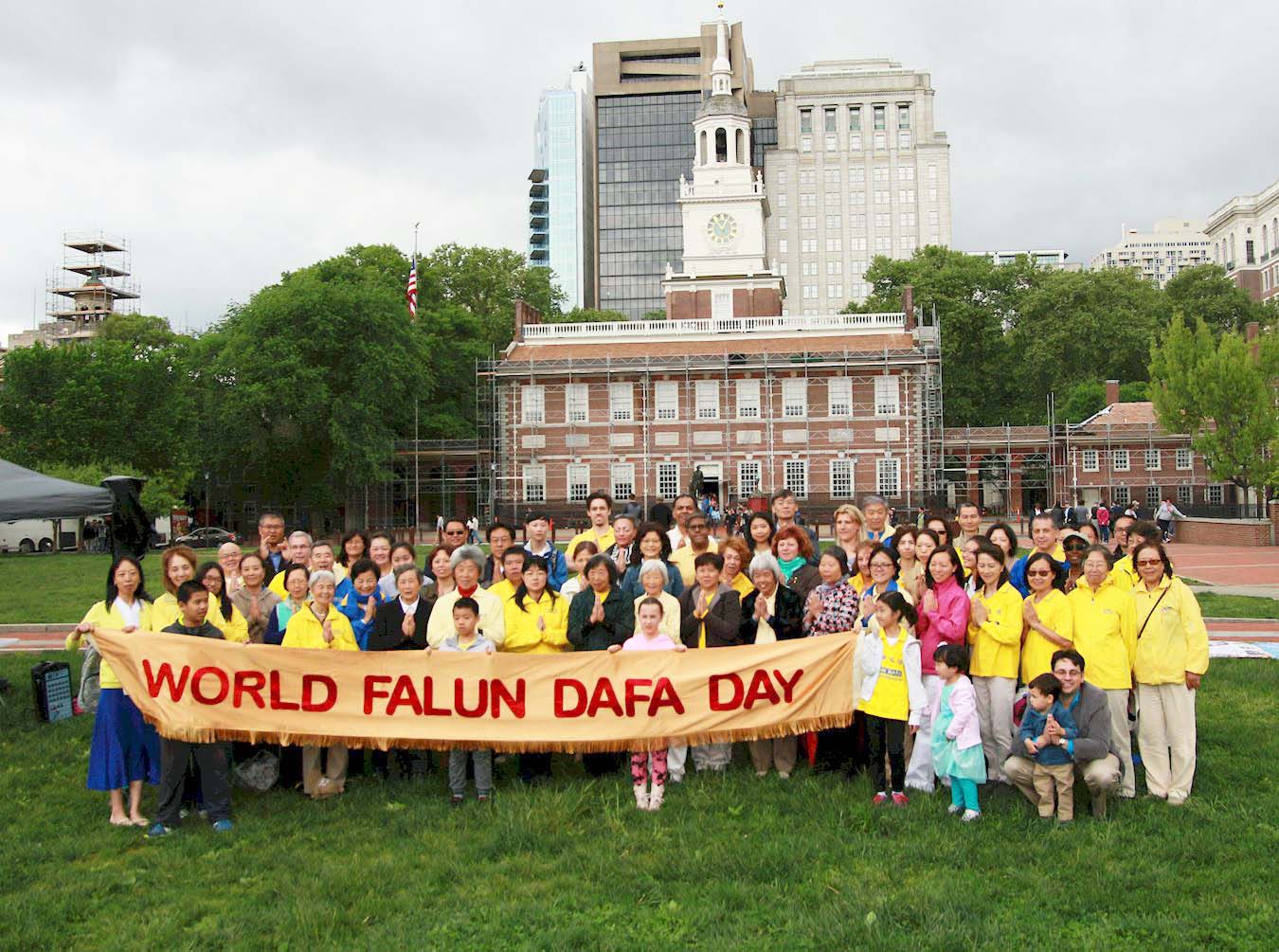 当天费城时有小雨,法轮功学员们在雨中坚持炼功的平静祥和场面令许多游客驻足观看,倾听真相,并纷纷在制止强摘器官表上签名声援,不少人表示想学炼法轮功。同时,宾州州长汤姆﹒伍尔夫(Tom Wolf)、宾州的美国国会参议员Patrick J. Toomey和Robert P. Casey、国会众议员Pat Meehan和Ryan Costello、费城市长James Kenney、宾州州参议员 Lawrence Farnese、州参议员Daylin Leach以及宾州州众议员Greg Vitali,都向大费城法轮大法协会发来贺信。费城市议员Mark Squilla专程赶到现场、同时代表另一位市议员Bobby Henon送来贺信,与法轮功学员们同庆法轮大法日。活动中,多位法轮功学员在集会上发言,陈述修炼法轮功后身心受益的经历,并呼吁人们关注和帮助制止中国大陆仍在进行的对法轮功学员的迫害。