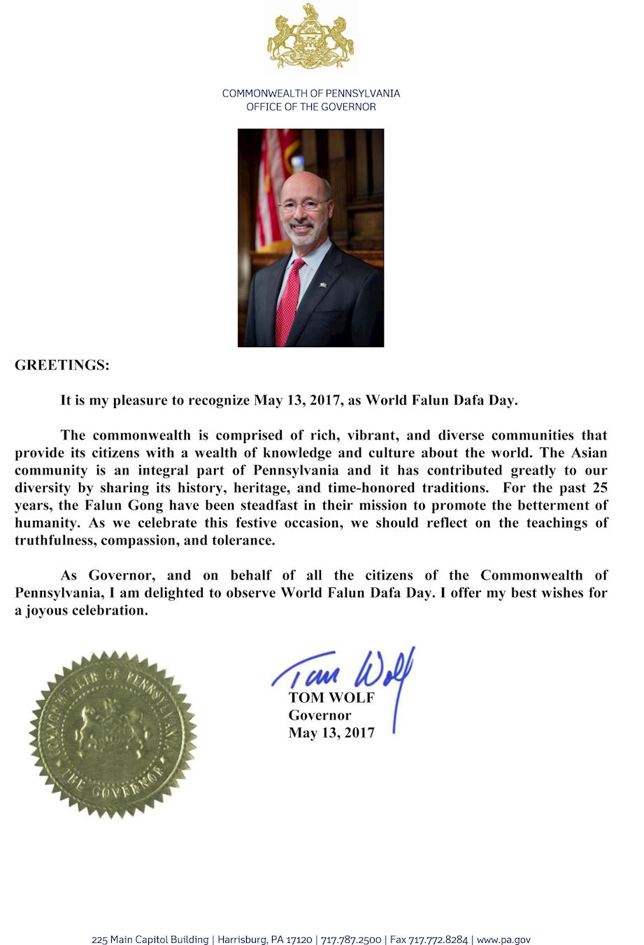 宾州州长汤姆﹒伍尔夫(Tom Wolf)和多位宾州的美国国会议员都向大费城法轮大法协会发来贺信,祝贺世界法轮大法日。
