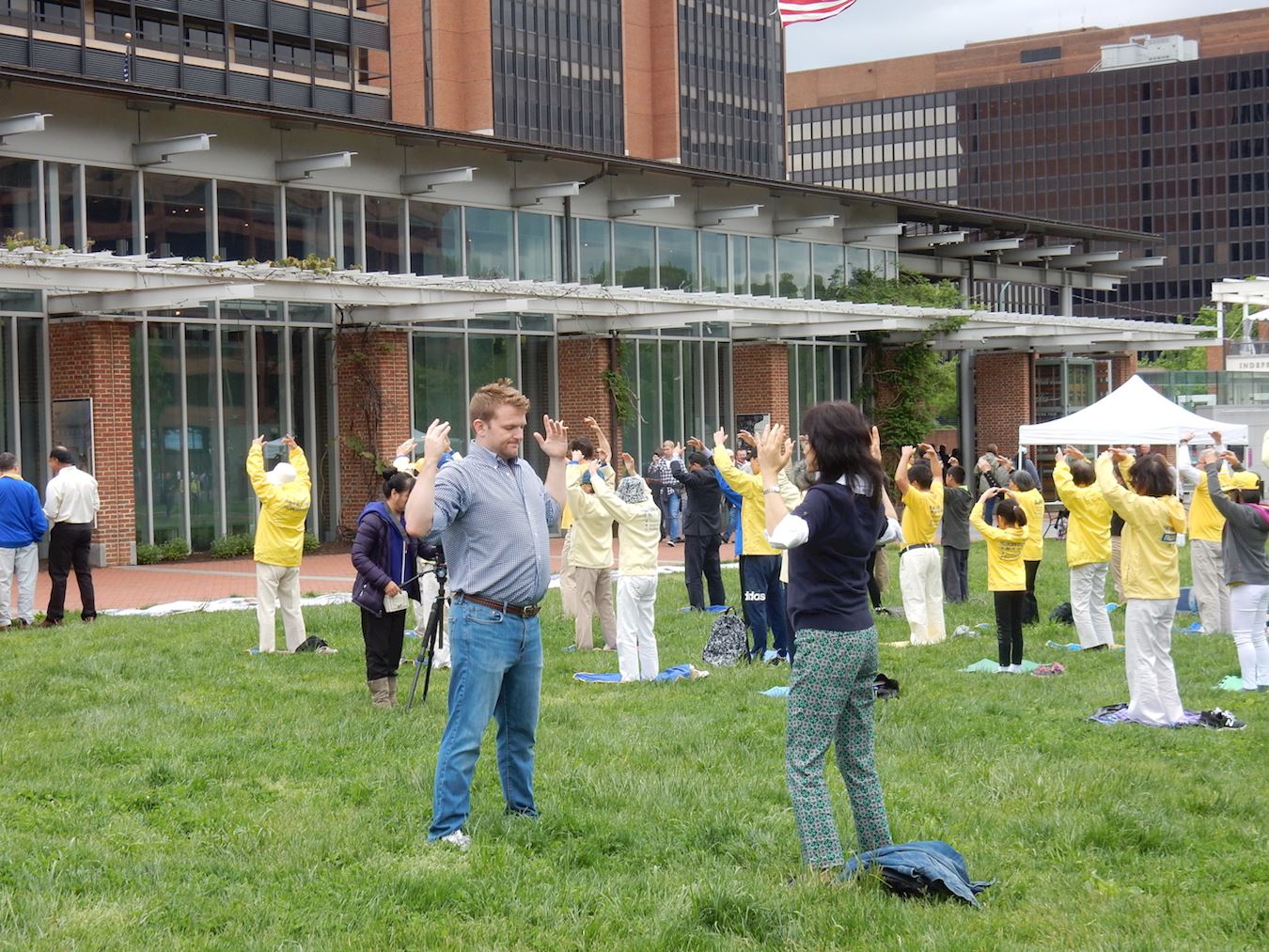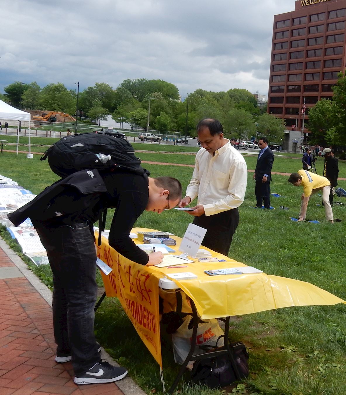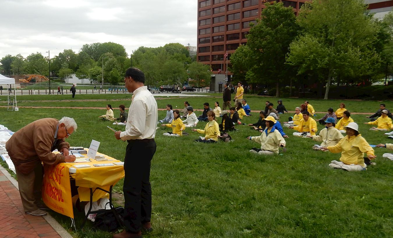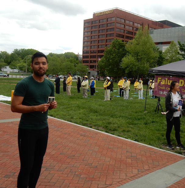 在费城一家机构工作的印裔美国人Rohm被法轮功学员炼功的祥和场面所吸引,一直站在旁边静静地观看,他说:“他们看起来很安宁,动作流畅,让人看着很舒服,我正在想自己是否要试一试。”当法轮功学员告诉他每周末这里都有免费教功时,他表示自己以后会来学炼。Rohm还拿取了法轮功真相资料,并表示支持法轮功学员们的反迫害。