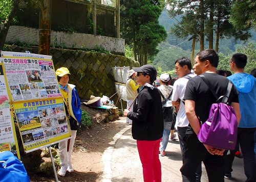 ![]() 图6-7:中国大陆游客在阿里山景点看法轮功真相展板 |