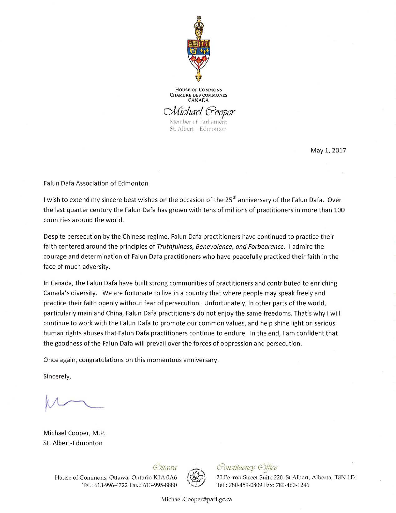 【明慧网二零一七年五月九日】二零一七年五月十三日是法轮大法洪传二十五周年纪念日,加拿大阿尔伯塔省(亚省)的国会议员们纷纷向埃德蒙顿法轮大法协会和卡尔加里法轮大法协会发来贺信,感谢法轮大法给世界带来的和平与健康,赞颂法轮大法所倡导的真、善、忍原则,谴责发生在中国的对法轮大法和法轮大法学员的迫害,支持法轮功学员为反迫害所做的不懈的努力,并表示加拿大政府有责任捍卫和保护中国及世界的宗教自由与基本人权。