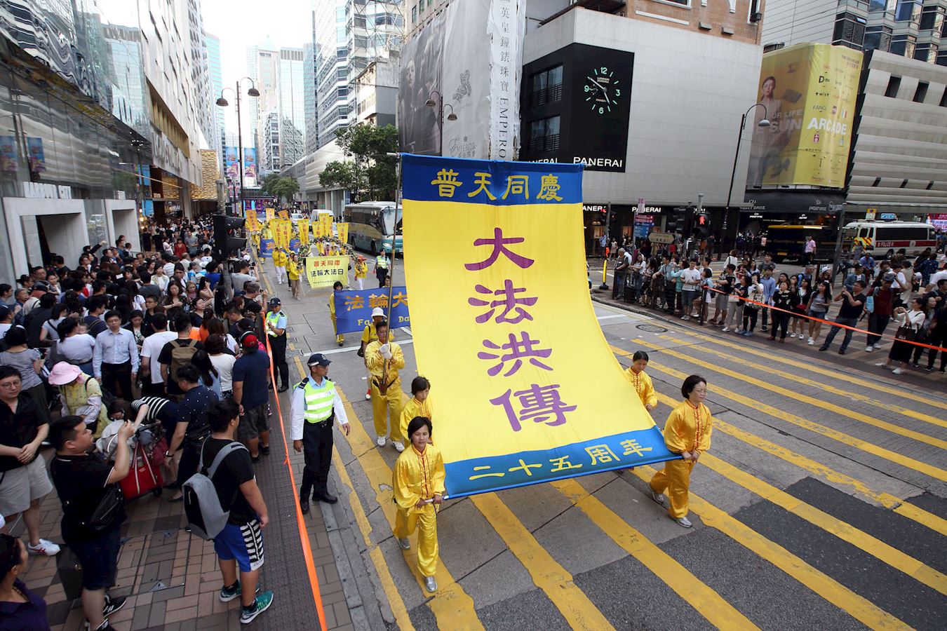 上午,法轮功学员在中环爱丁堡广场上排出“大法”二字并演炼功法,展开一天的庆祝活动。“大法”是“法轮大法”的简称,也称法轮功,是由李洪志先生于一九九二年五月传出的佛家上乘修炼大法,以宇宙最高特性真、善、忍为根本指导,按照宇宙演化原理而修炼。经亿万人的修炼实践证明,李洪志先生所传的法轮大法在把真正修炼的人带到高层次的同时,对稳定社会、提高人们的身体素质和道德水准,也起到了不可估量的正面作用。