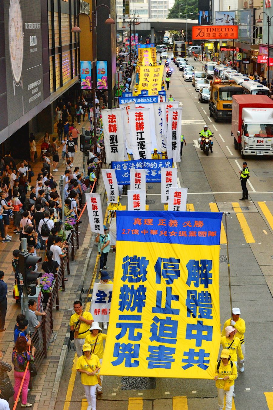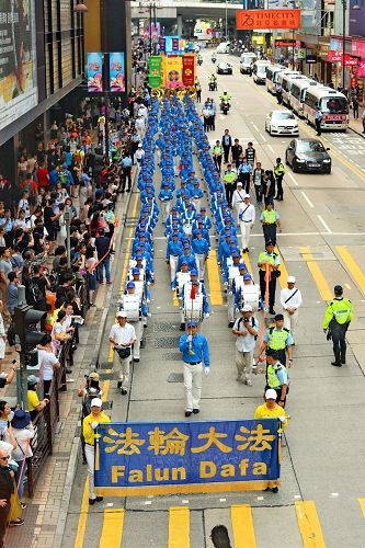 下午二时半,约七百名法轮功学员组成游行队伍,由天国乐团引领,从九龙枫树街游乐场出发,沿着长沙湾道、弥敦道、广东道前往终点尖沙咀码头。