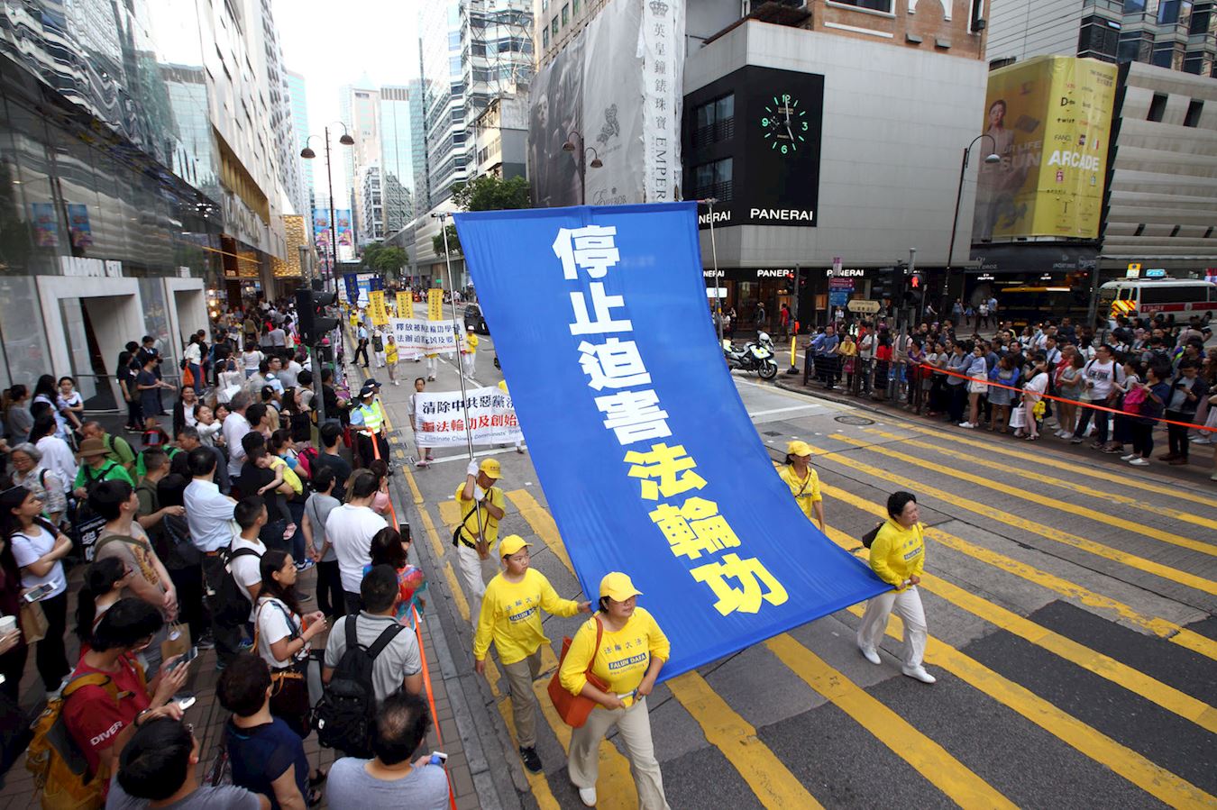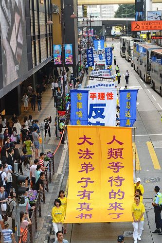 一位年轻小姐从深圳来港旅游,第一次看到法轮功学员的游行:“很有意思,挺震撼的,感觉还不错。”她认为每个都应有自己的信仰自由,支持法轮功的信仰自由。