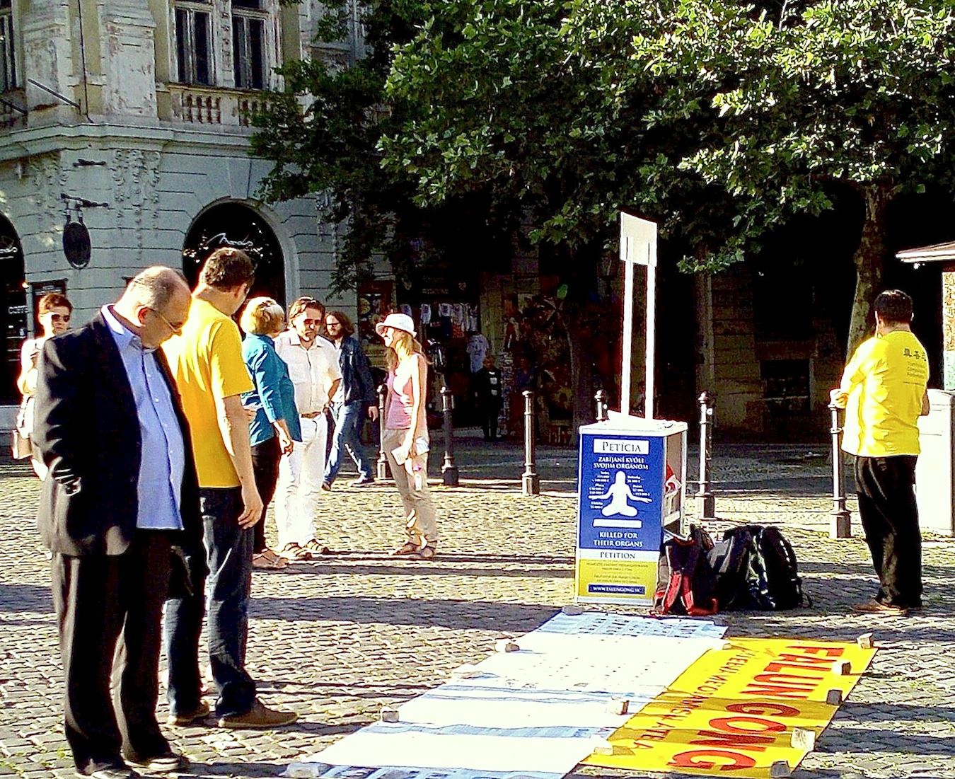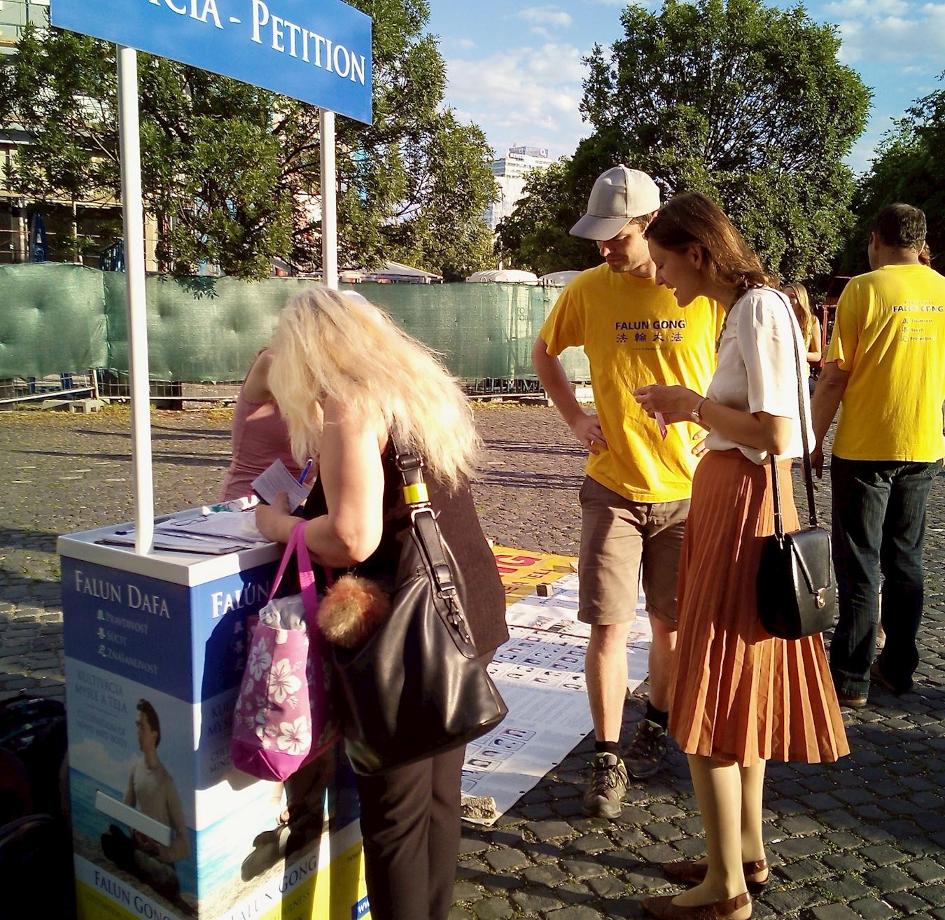 一位中国学员跟着大陆旅游团散发真相资料,讲真相劝三退。开始时,一个不明真相的中国人开始时大声嚷嚷,你在干什么?快叫警察!学员不紧不慢地答道:“这里不是中国,这是个民主国家,舆论自由,信仰自由。法轮功在斯洛伐克是注册的,是被尊重的,受法律保护的。即使警察来了,你看看是谁有道理啊?”听后他马上住嘴了。