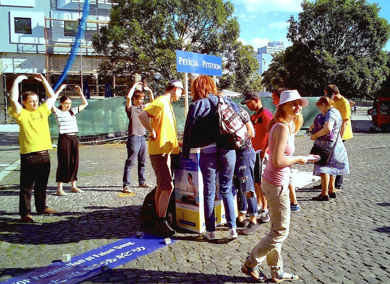 【明慧网二零一七年六月十三日】二零一七年六月十日下午,斯洛伐克首都的部份学员在市中心老城区摆开“停止迫害法轮功”横幅与法轮功真相横幅。学员们在祥和的炼功音乐中演示一至五套功法,部份学员在散发传单讲述法轮功的美好以及在中国大陆被迫害至今的真相。前来了解真相的有大学教师,有医院的大夫,有气功爱好者,有办学研究气功与哲学的著名学者,也有政府工作人员等等。