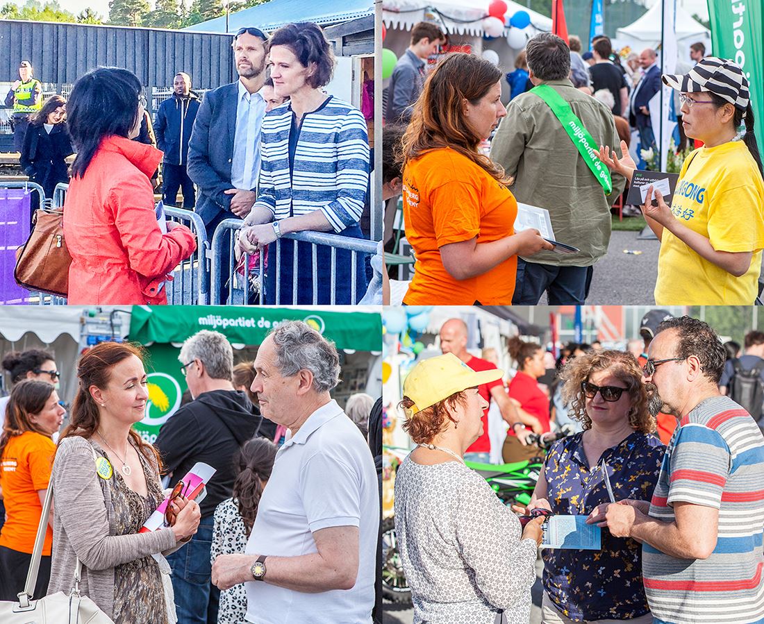 瑞典法轮大法学会也参加了此次活动并被主办方安排在了正对着演讲台、大屏幕对面的一个很显眼的展位。政治周期间,法轮功学员们向前来参加活动的各党派主席、政治家、政府官员及各界人士介绍什么是法轮功并进行功法演示,同时揭露中共造谣污蔑法轮功的事实真相,征集反迫害签名。