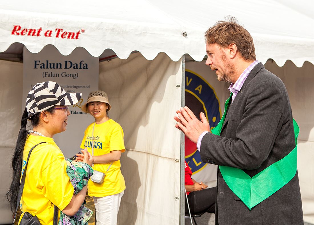 ![]() 图4,明白了真相的瑞典环境党成员雅各布·丹克(Jacob Dencker)先生,为自己以前对法轮功的误解感到懊悔。活动期间每次他经过学员的展位时,都会过来打个招呼。 |