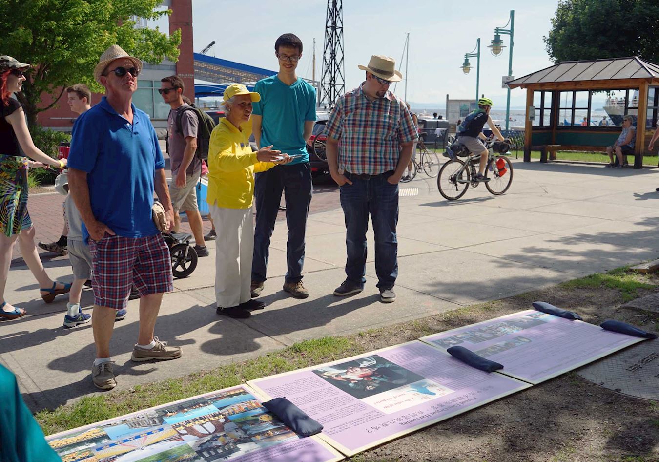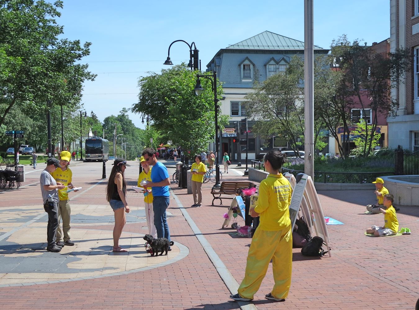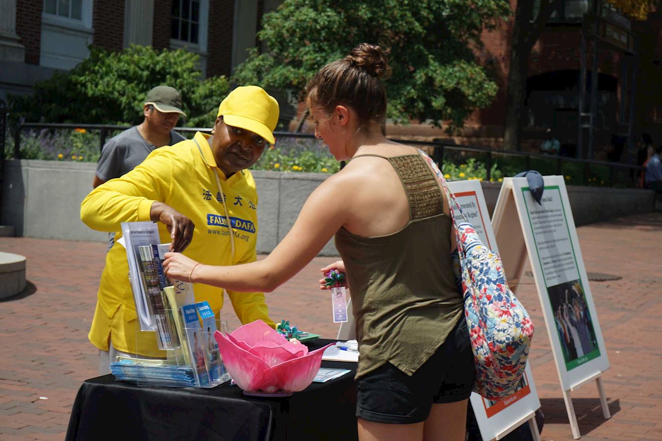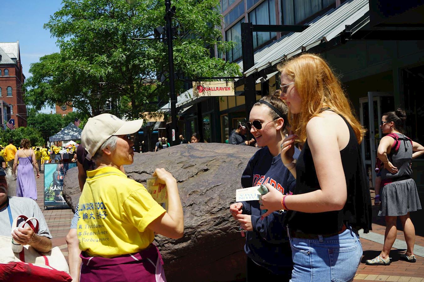 ![]() 图7:法轮功学员在佛蒙特州伯灵顿市街区给游人讲法轮功真相。 |