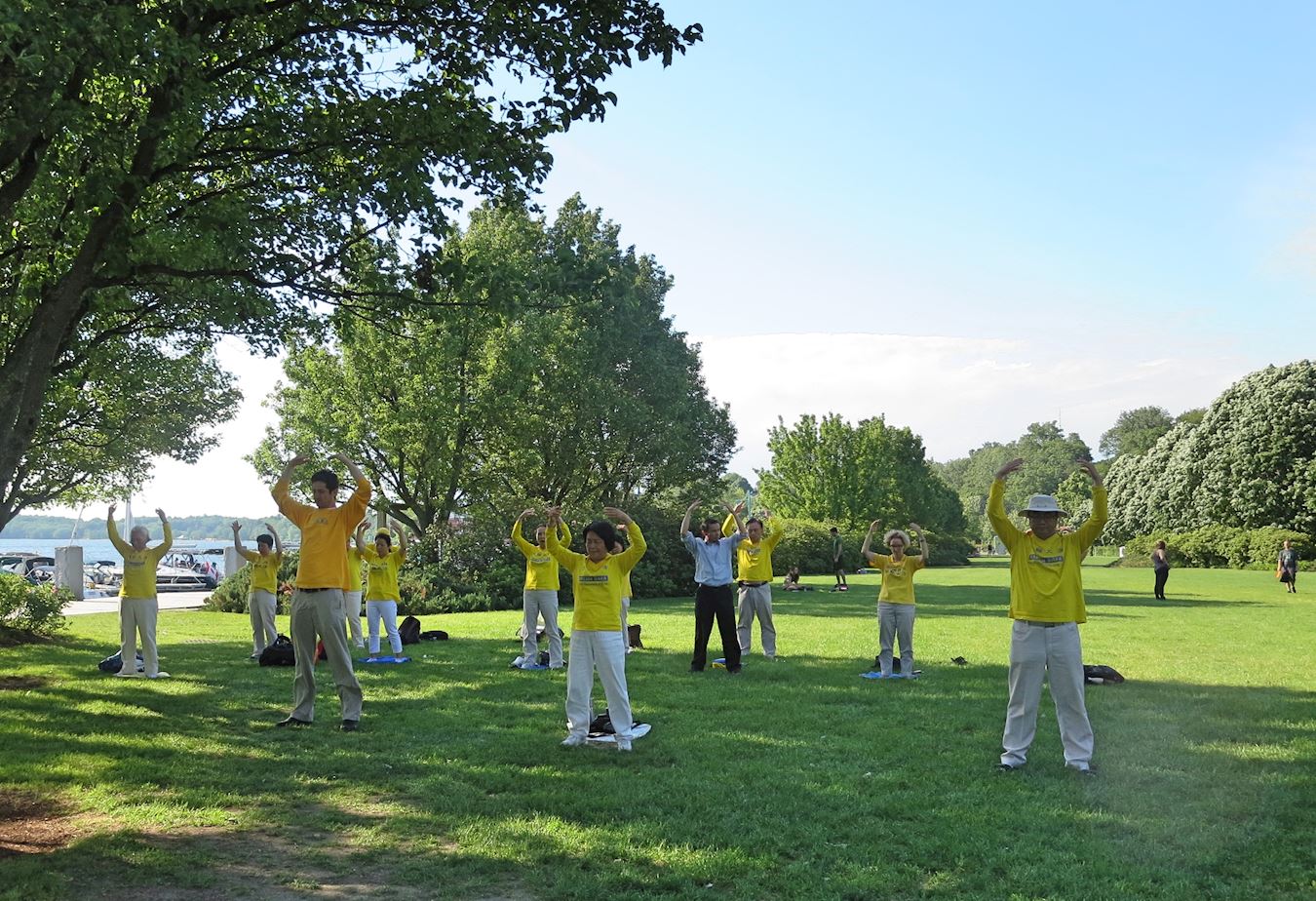 另外,有部份法轮功学员在风景优美的湖滨公园展示五套祥和优美的功法,介绍法轮功,并征集签名,呼吁制止中共在中国大陆对法轮功修炼人的残酷迫害。有的民众现场跟法轮功学员认真学炼功法,并表示要参加当地学员近期举办的九天班学法轮功。