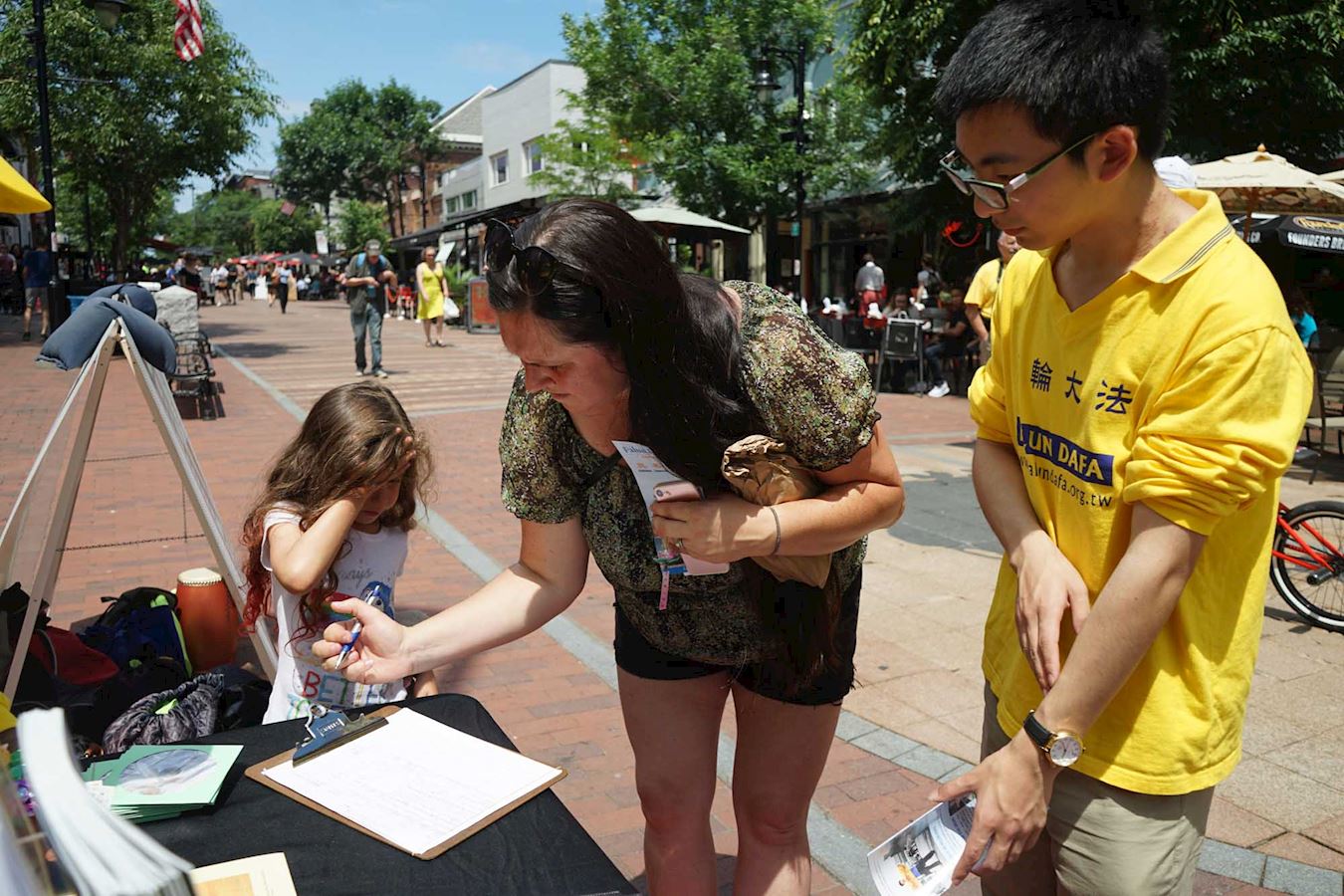 ![]() 图6:这位带着女儿的母亲听完法轮功学员的讲解后,在反酷刑及活摘的征签表上签名。 |