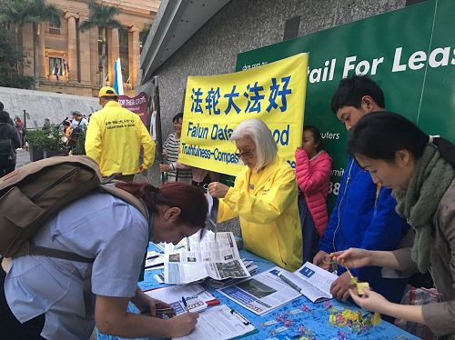 ![]() 图1:二零一七年六月二十三日下午,澳洲昆士兰部份法轮功学员在布里斯本市中心中领馆对面的乔治国王广场(King George Square)举办讲真相活动,向当地民众传播法轮功的真相。 |