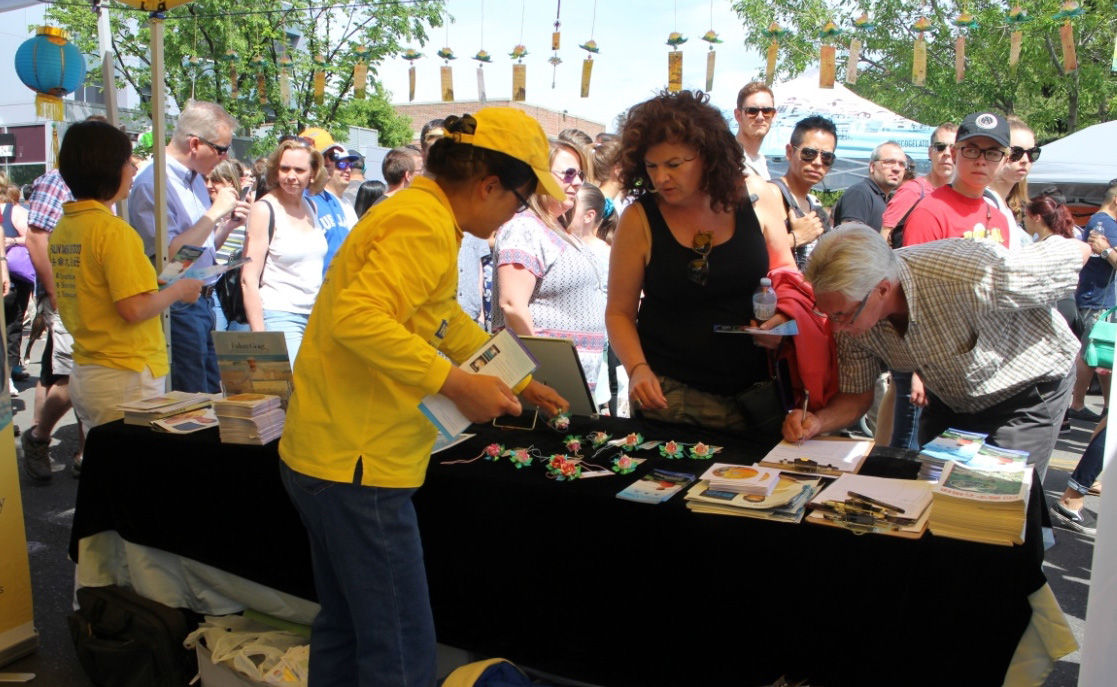 许多人来到法轮大法的展位前,向法轮功学员表示友好,对中共十八年来的迫害感到厌恶。一位花白头发的白人女士说:中国共产党很邪恶,它一定会淋漓尽致的表现给世人看,迫害法轮功就是一个例子。她非常希望迫害可以被很快结束,共产党可以早点被扫出历史舞台。