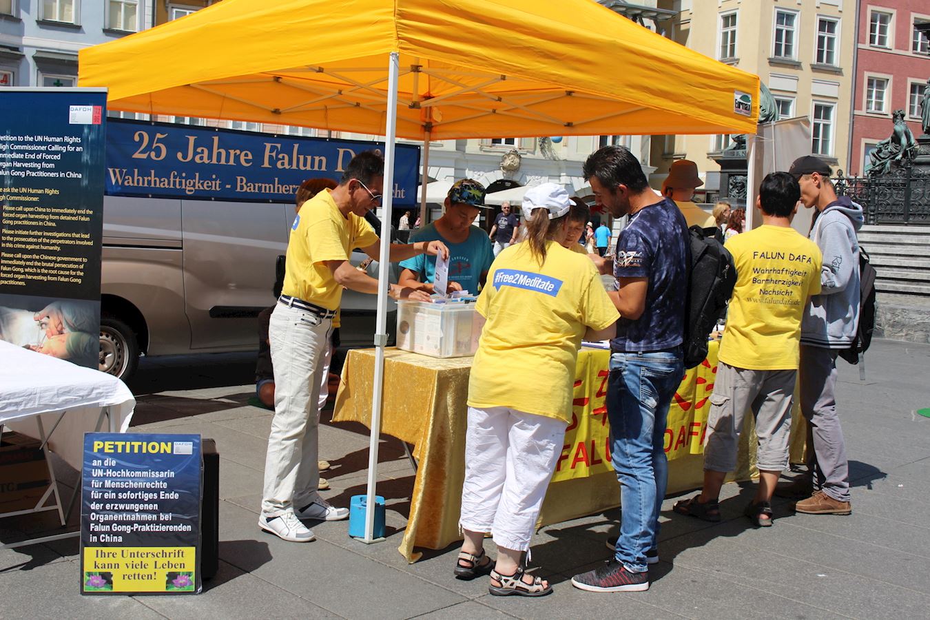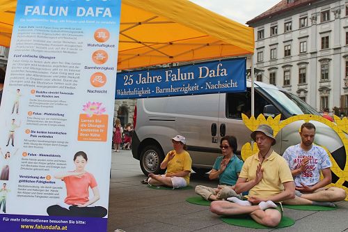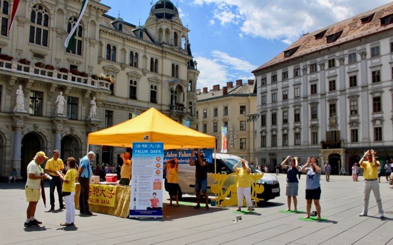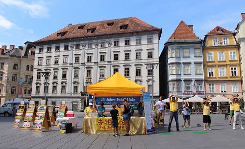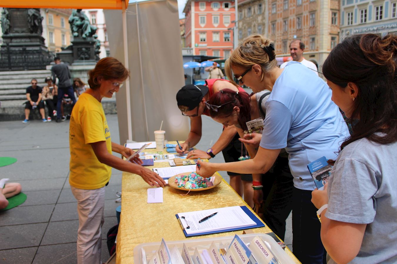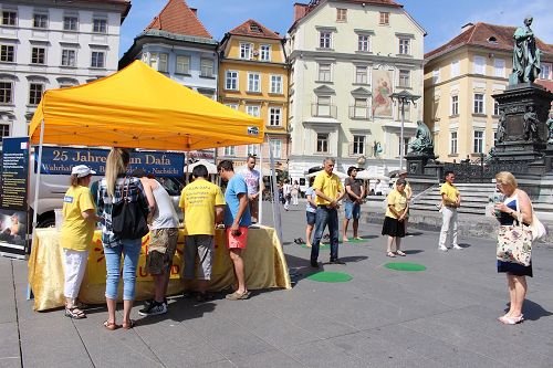 法轮功学员在格拉茨省政府和市政府所在地 Hauptplatz广场举行信息日活动,纪念法轮功学员从一九九九年七月二十日以来的反迫害十八周年。