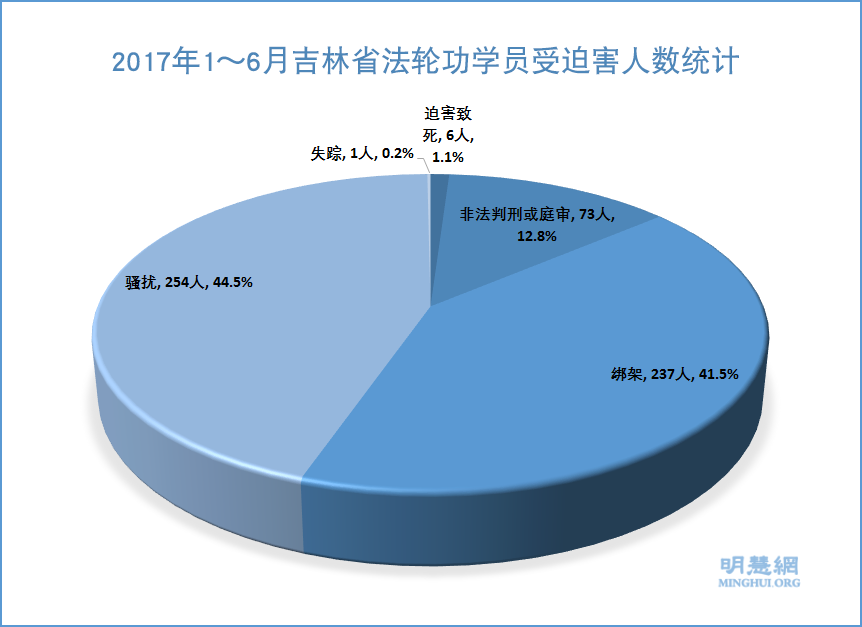 ![]() 图1:2017年1~6月吉林省法轮功学员受迫害人数统计 |