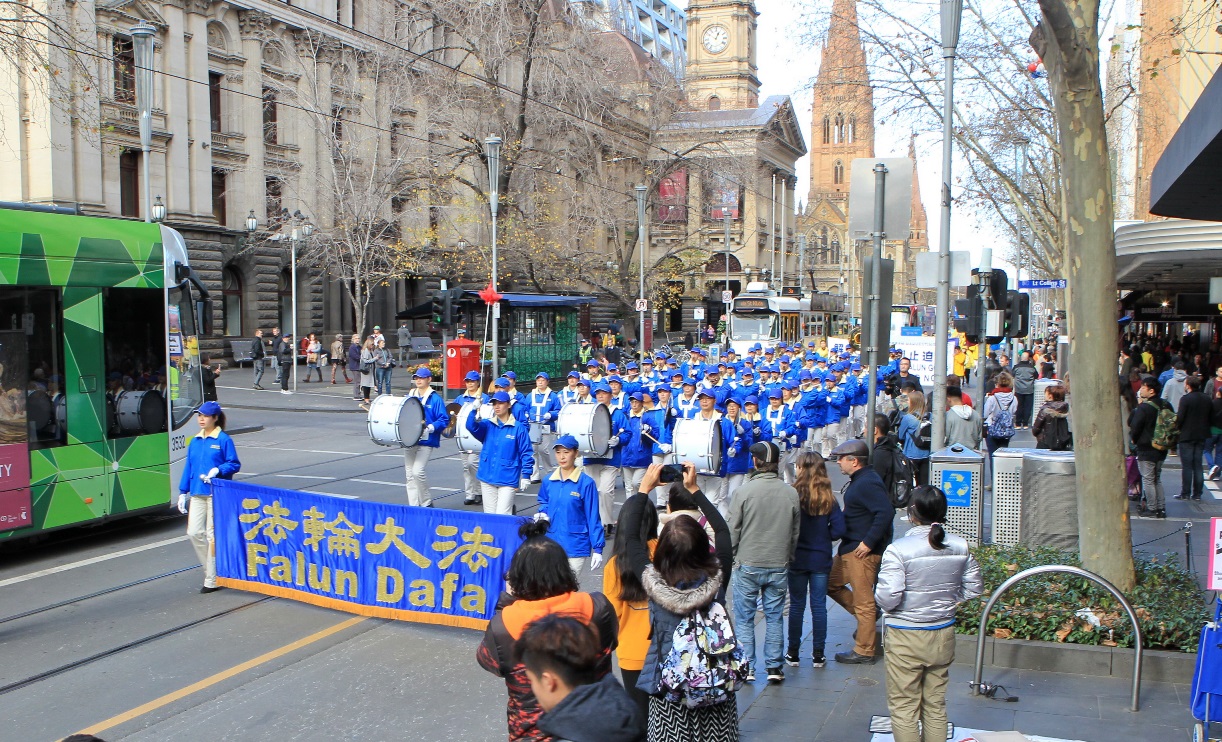 游行从墨尔本市中心的Alexandra Gardens出发,队伍由身着蓝衣白裤的天国乐团引领,嘹亮的军乐声让市民和游人纷纷驻足。紧跟在天国乐团后面的是三个方阵。第一方阵主题为“法轮功好”,展示了巨型法轮功书籍、花车。身着黄色炼功服的法轮功学员还向民众演示了优美、祥和的功法。
