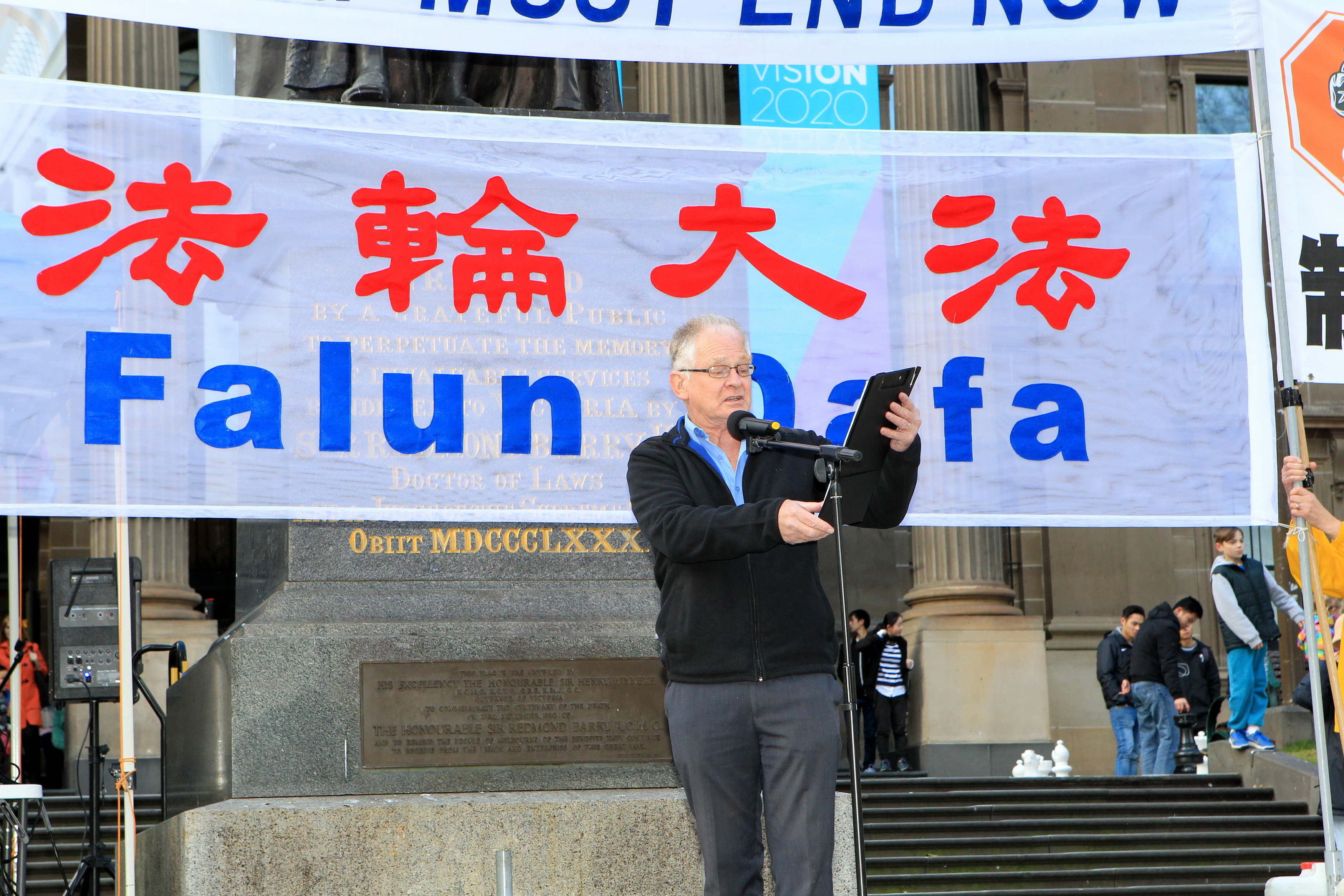七月十五日当天在州立图书馆(State Library)前的集会现场,多位政界和社区领袖到场发表演讲,支持法轮功学员坚持不懈的反迫害义举。