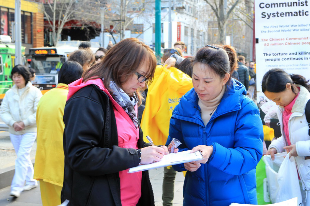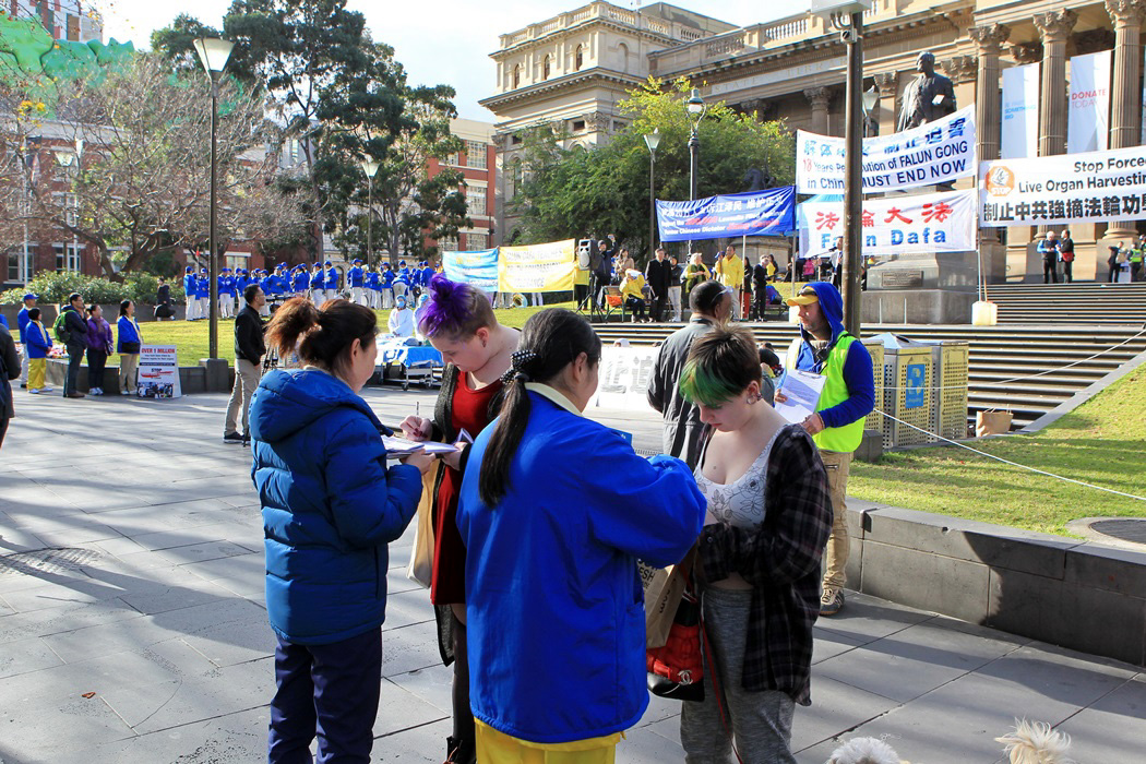 当天的集会吸引了各族裔民众驻足观看。很多法轮功学员向市民传递法轮功受迫害的资料。市民了解到真相后,都表示非常震惊,并纷纷在停止迫害征签表上签名表示支持。