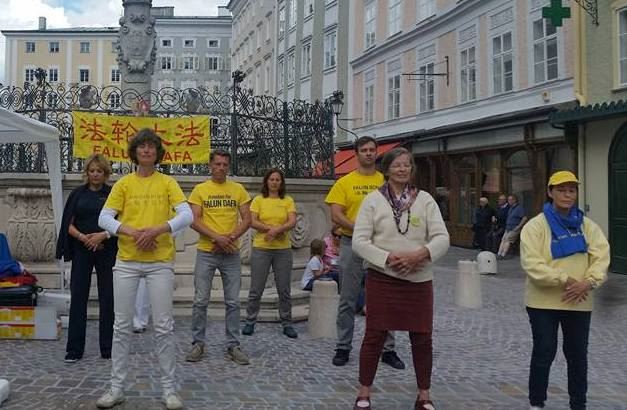 ![]() 图2,法轮功学员在萨尔斯堡市中心老城演示功法 |