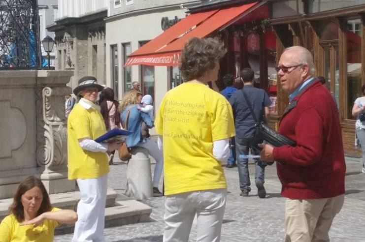 ![]() 图3,法轮功学员在萨尔斯堡市中心老城向路人讲真相 |