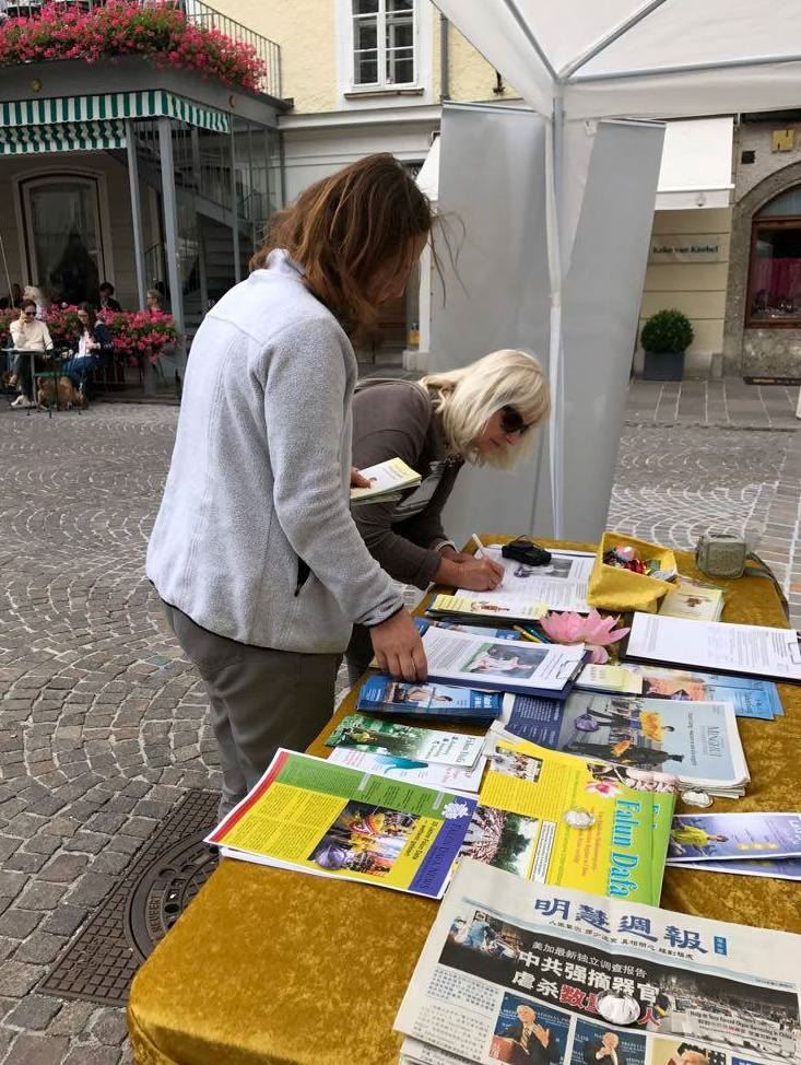 当天活动在萨尔斯堡市中心老城举行,正值旅游旺季,法轮功学员的活动吸引了来自世界各地的游客和当地民众。人们对中共活摘法轮功学员器官的暴行感到震惊和气愤,并在反迫害的征签表格上签字,以帮助制止这场持续了十八年的浩劫。