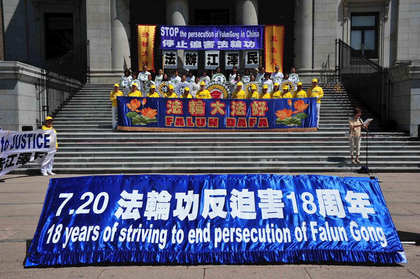 '图1~3:温哥华法轮功学员集会纪念720反迫害18周年。'