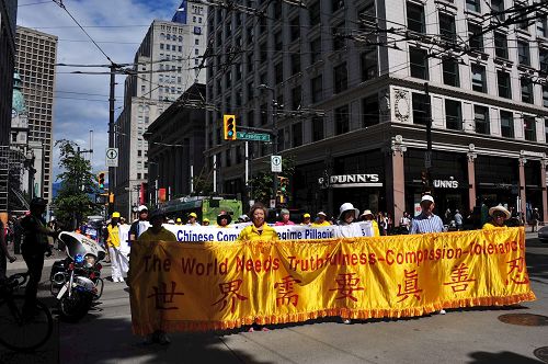 图5~11:温哥华法轮功学员在繁华的市中心举行反迫害十八周年游行。