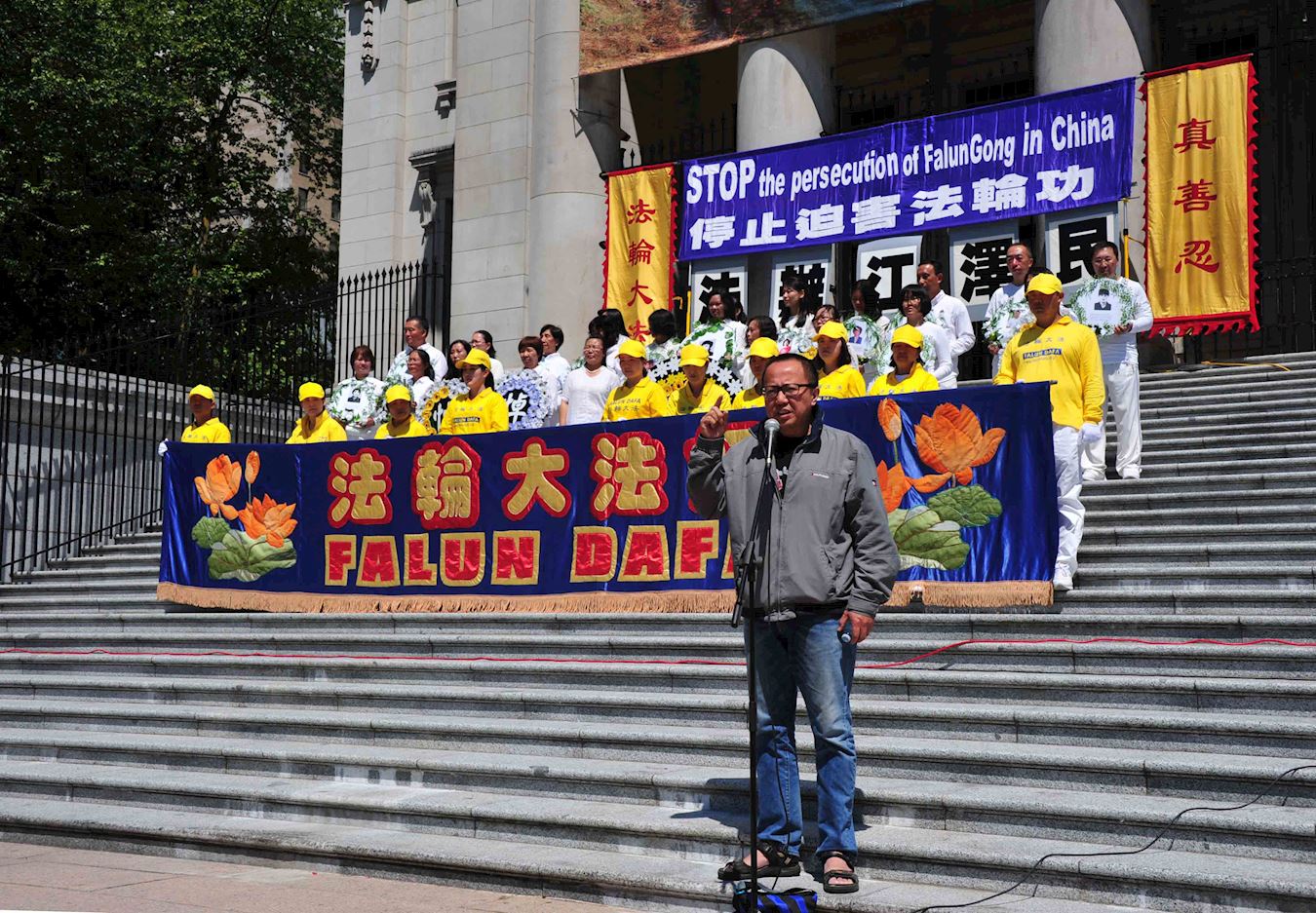 图12:原大陆高级法官李建峰参加了集会并即席发言,他赞扬法轮功学员传播真善忍,提升道德造福子孙后代。
