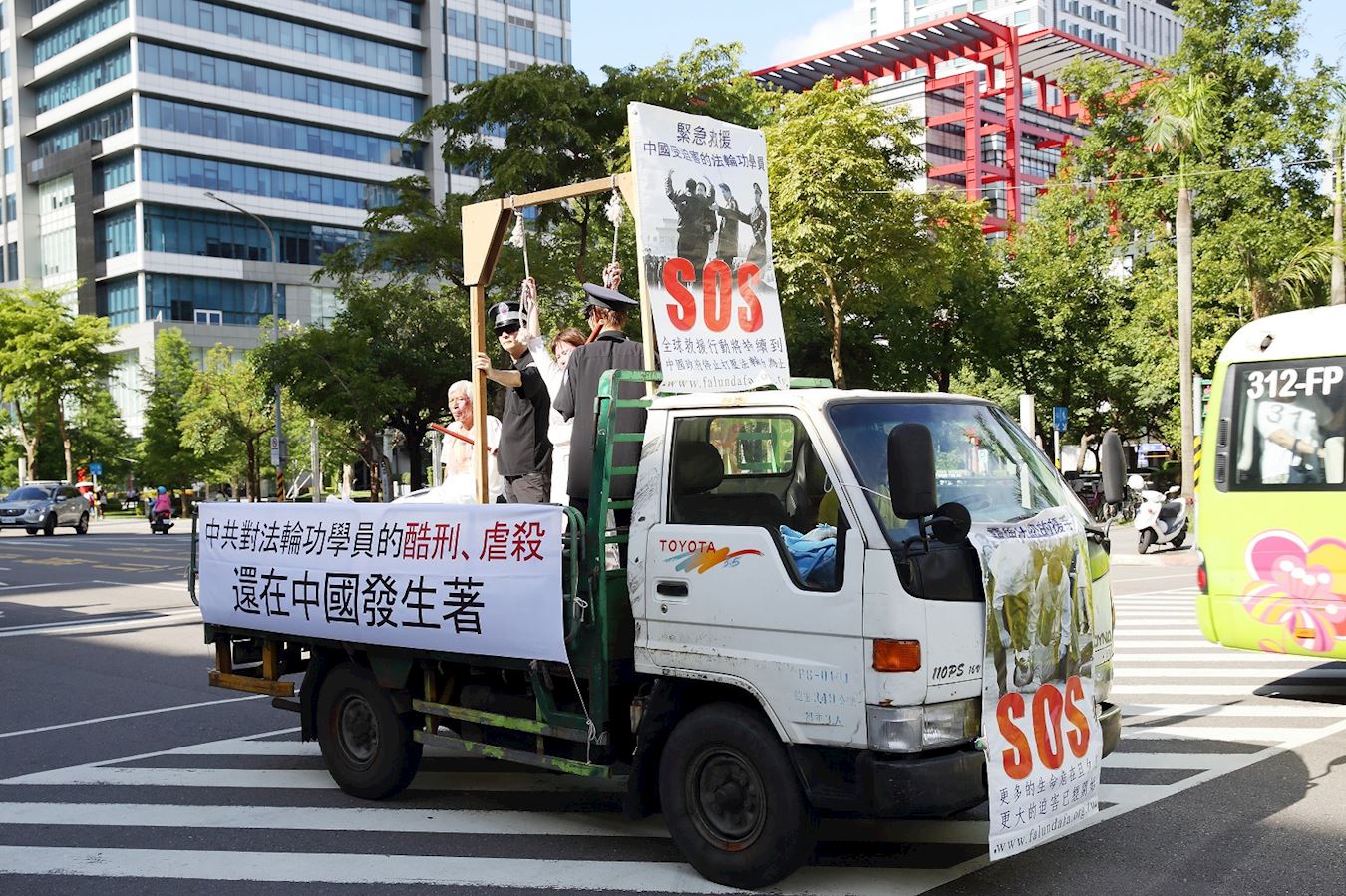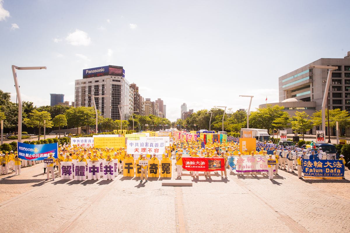 '图1~9:台湾法轮功学员在台北市政府前信义广场举行“法轮功学员反迫害十八周年”大游行,呼吁善良正义的民众,共同制止中共的邪恶迫害。'