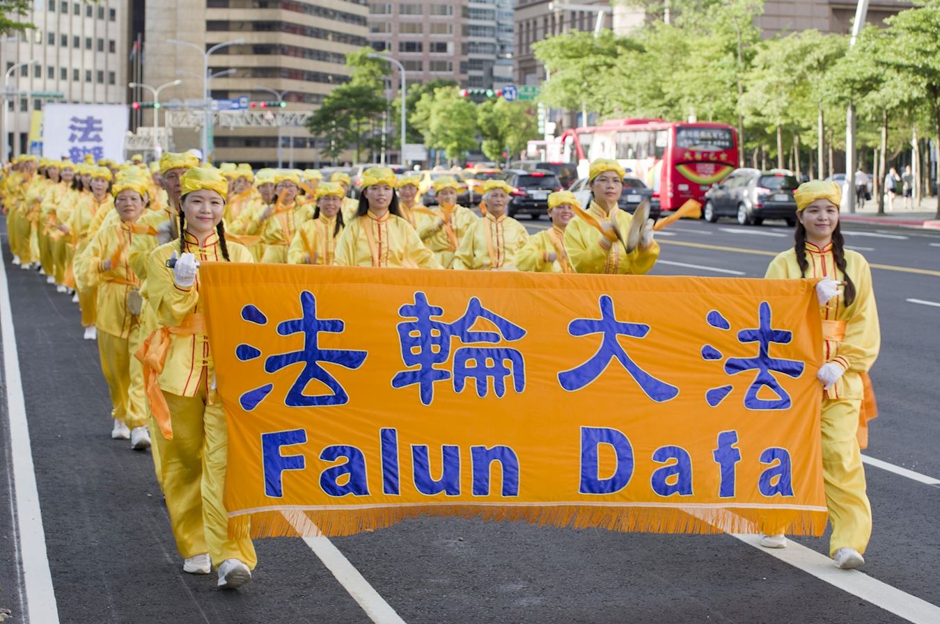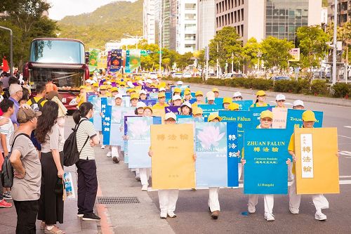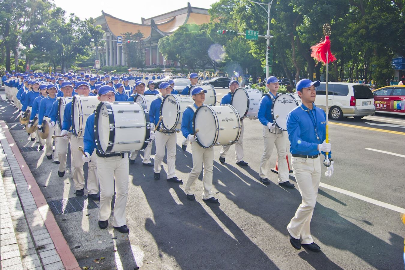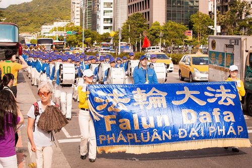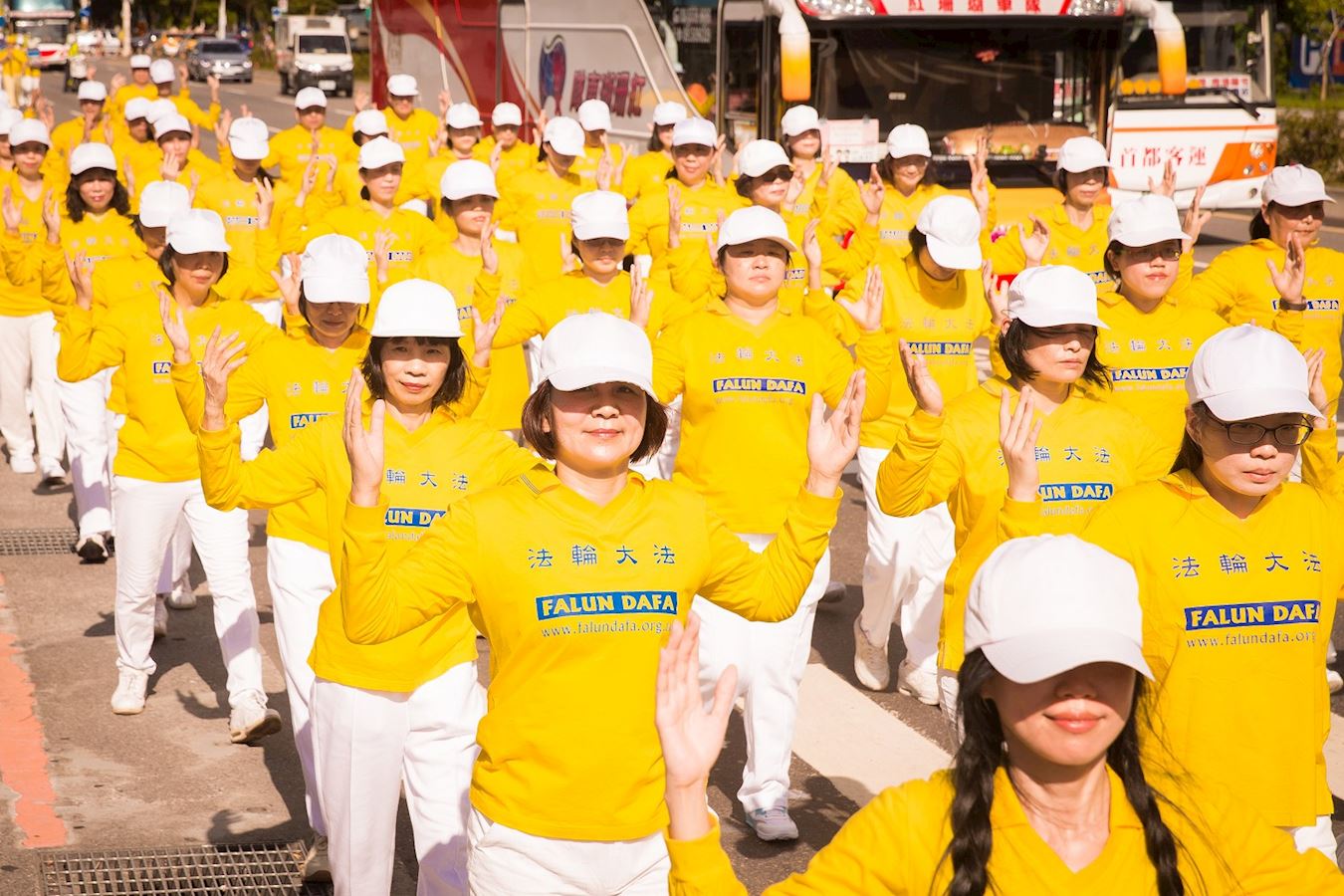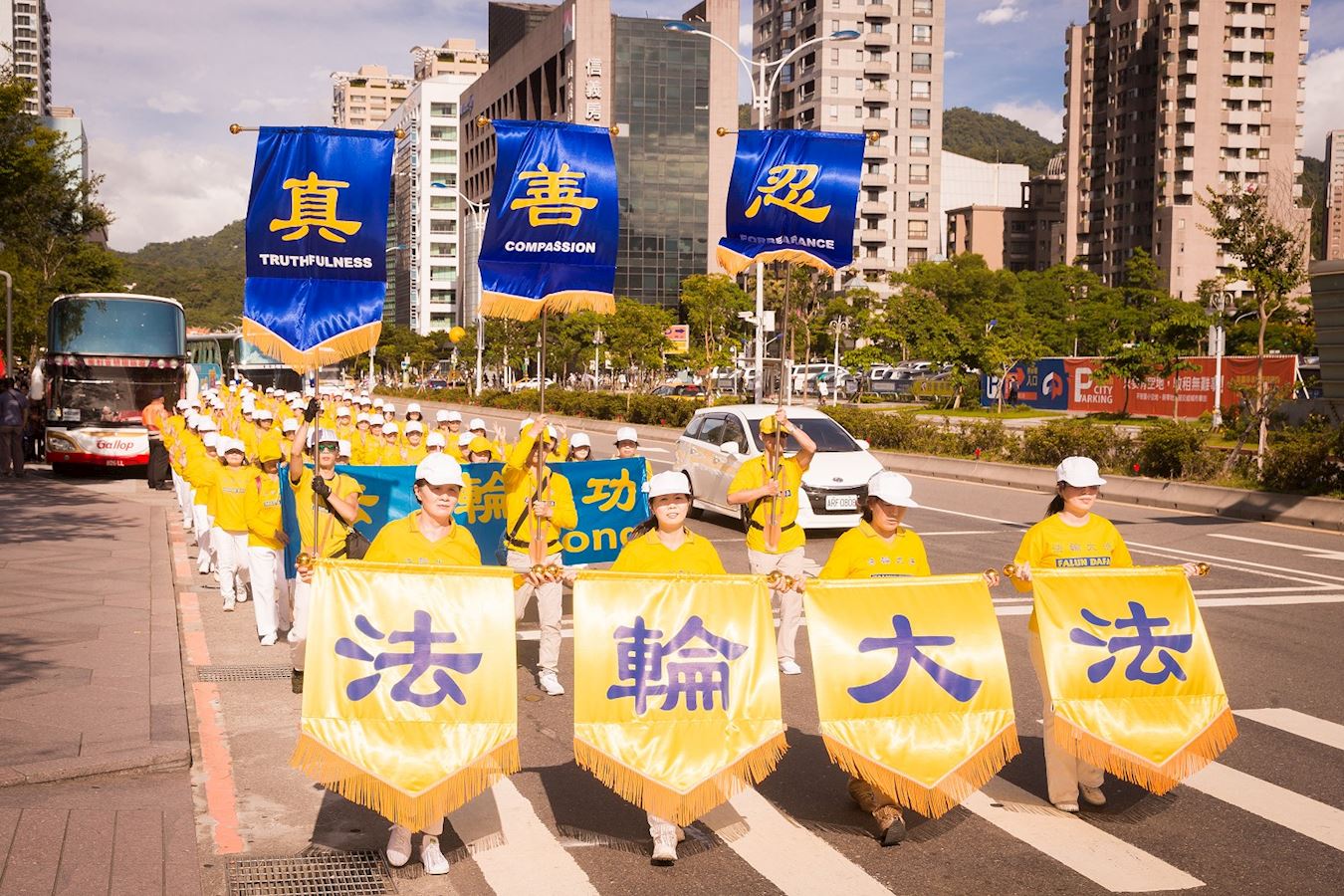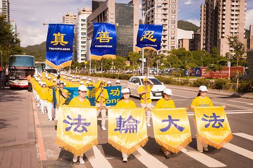 台北市政府前的市民广场,下午三点到六点,台湾法轮功学员在现场教民众五套功法,还有法轮大法“正法之路图片展”活动。下午三点二十分由气势磅礴的天国乐团演奏雄壮的乐曲领队,法轮功学员游行队伍开始出发,后面有“大法洪传”、“千古奇冤”、“结束迫害”等整齐的队伍,行经一零一大楼国际金融中心,穿越台北最繁荣的信义商圈与东区街头,行经台北市政府及各大学等文教区域,终点抵达台北市政府前的市民广场,全程共五点三公里。