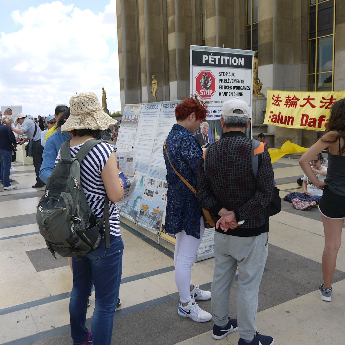 小学教师格雷戈尔(Grégoire )刚在人权广场旁边的人类博物馆看过有关种族、人性及反人类罪行的展览,出来又得知在中国发生的对法轮功的迫害,他说:“我感到震惊。那些统治者在迫害人民,贩卖人体器官,牟取暴利,必须要揭露他们,让世人都知道,制止这场迫害。为了人道的理由,我和你们站在一起。”