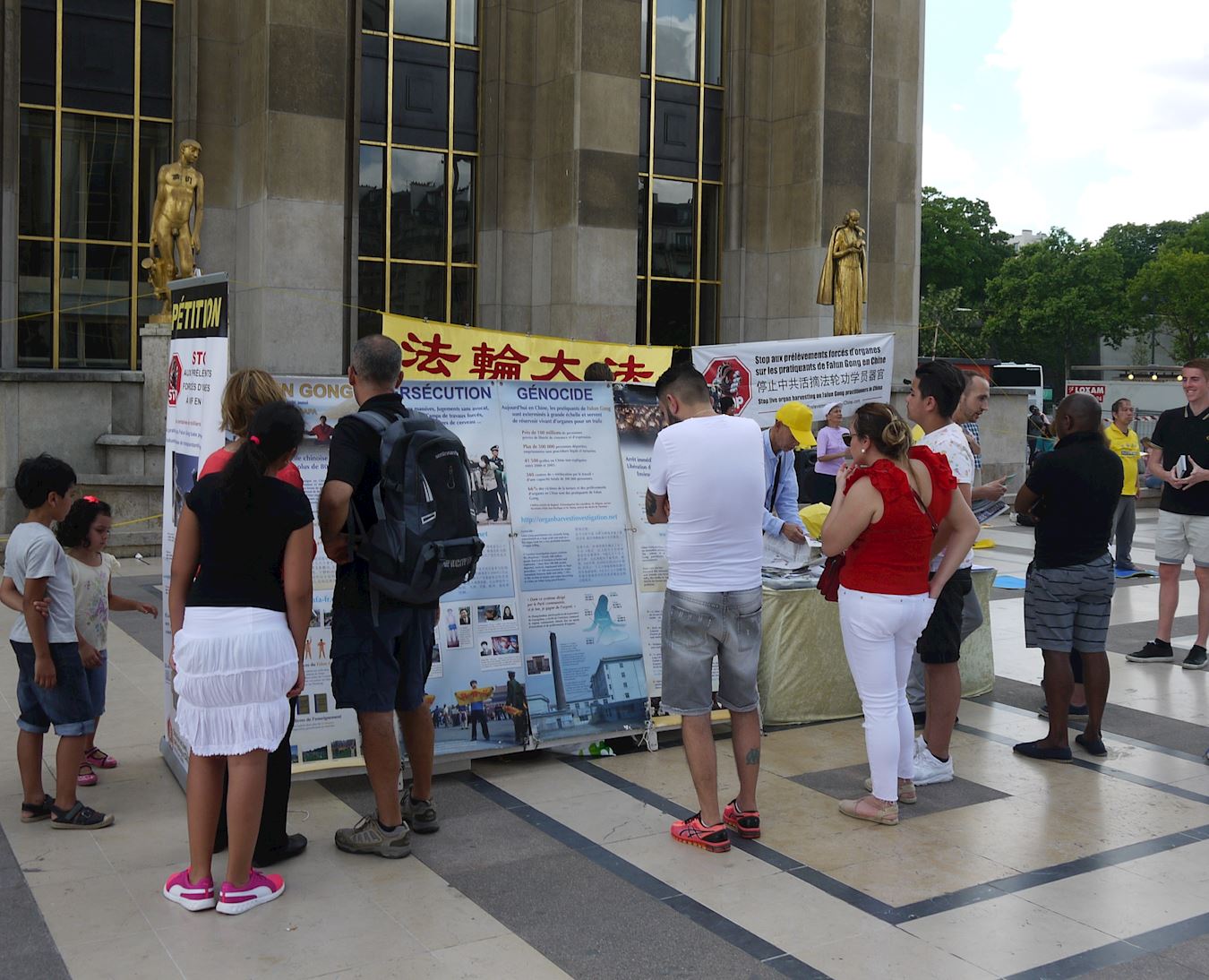 '图1~2:巴黎人权广场上,游人驻足了解法轮功真相'