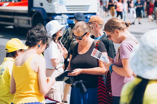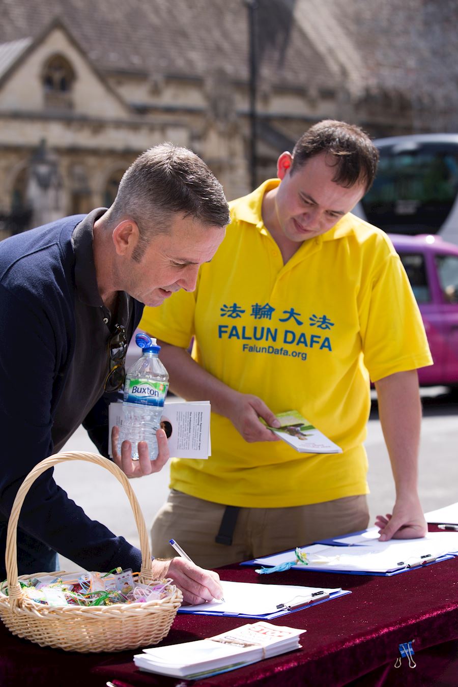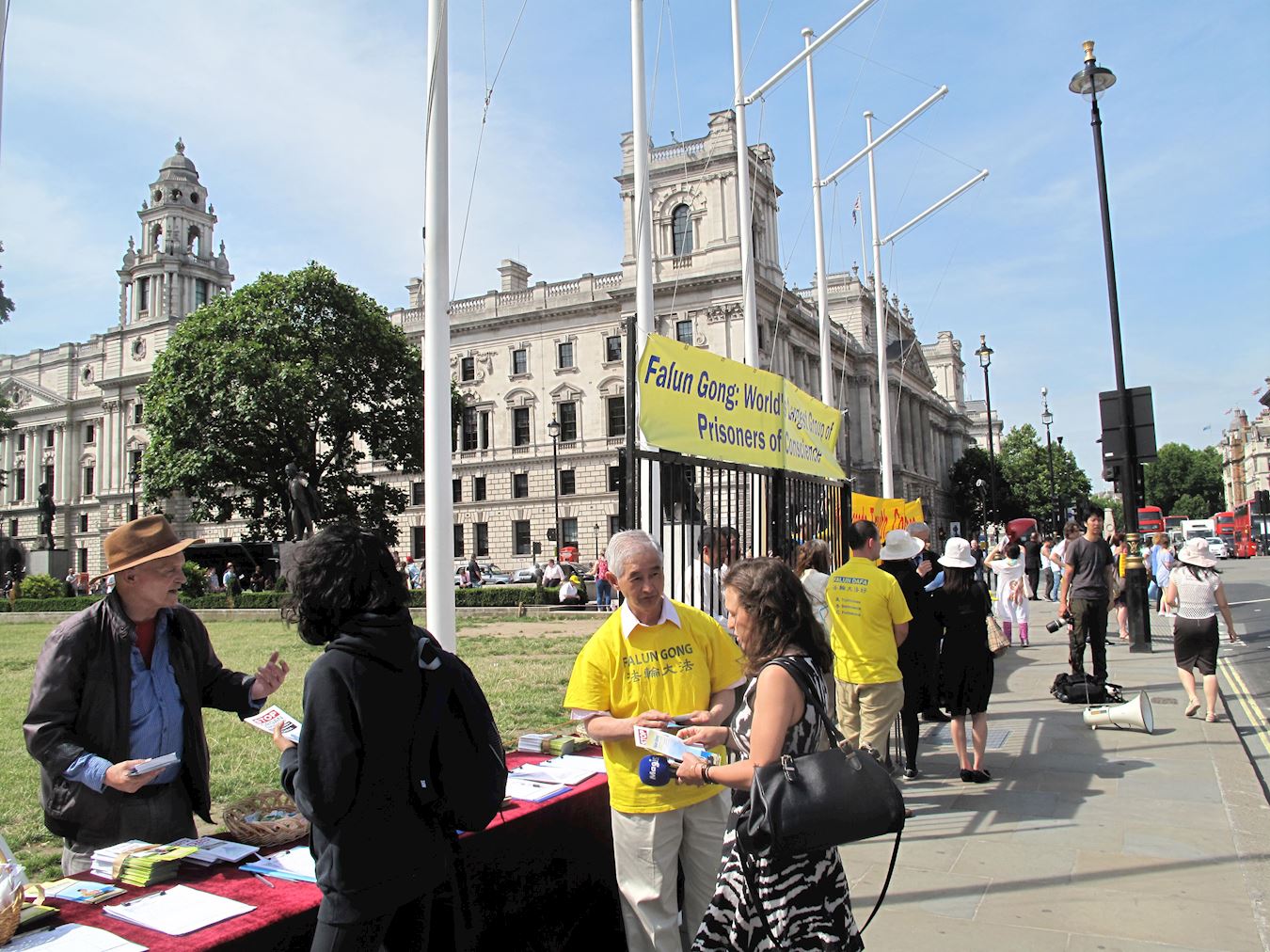 从事医学研究的丽塔(Rita)女士住在伦敦,当天下午她经过议会大厦广场时偶然遇到了法轮功学员的讲真相活动,她认真阅读了真相传单,她感到震惊,于是她用智能手机慢慢录下法轮功学员全部活动内容,特别是法轮功学员宁静祥和的炼功场面,并用自己的社交媒体在线实时播放,她接着到信息台前签名反迫害,她说:“我当然要签这个名。”“中共‘活摘’器官,太糟糕了,还有其它的一切(迫害),这都太过分了。”最后她表示要尽努力去传播法轮功真相。