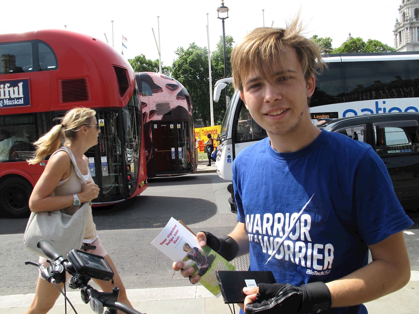 加布里埃尔(Gabriel)是个罗马尼亚中学生,来伦敦旅游,住在在伦敦工作的哥哥家,骑车路过英议会广场前时被路对面法轮功学员炼功、讲真相的场面吸引住了,驻足观看,这时有法轮功学员递给他真相传单。加布里埃尔说他从来没有听说过法轮功,于是法轮功学员给他讲基本真相,告诉他中共为什么迫害法轮功,听了一会儿,这个男孩马上用不太流利的英语表示:“我明白了,我知道共产党不好。”“现在我们罗马尼亚都不要共产党。”