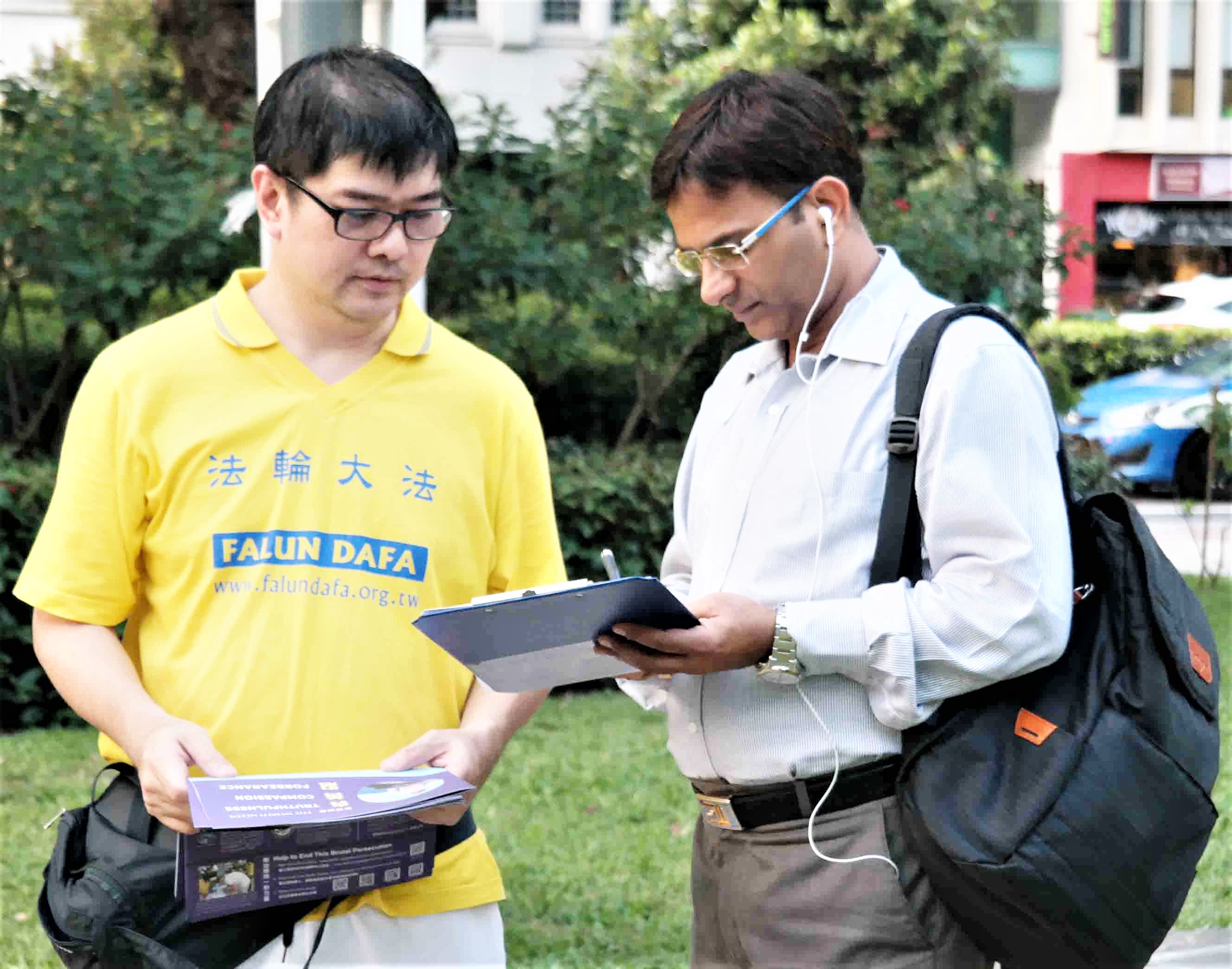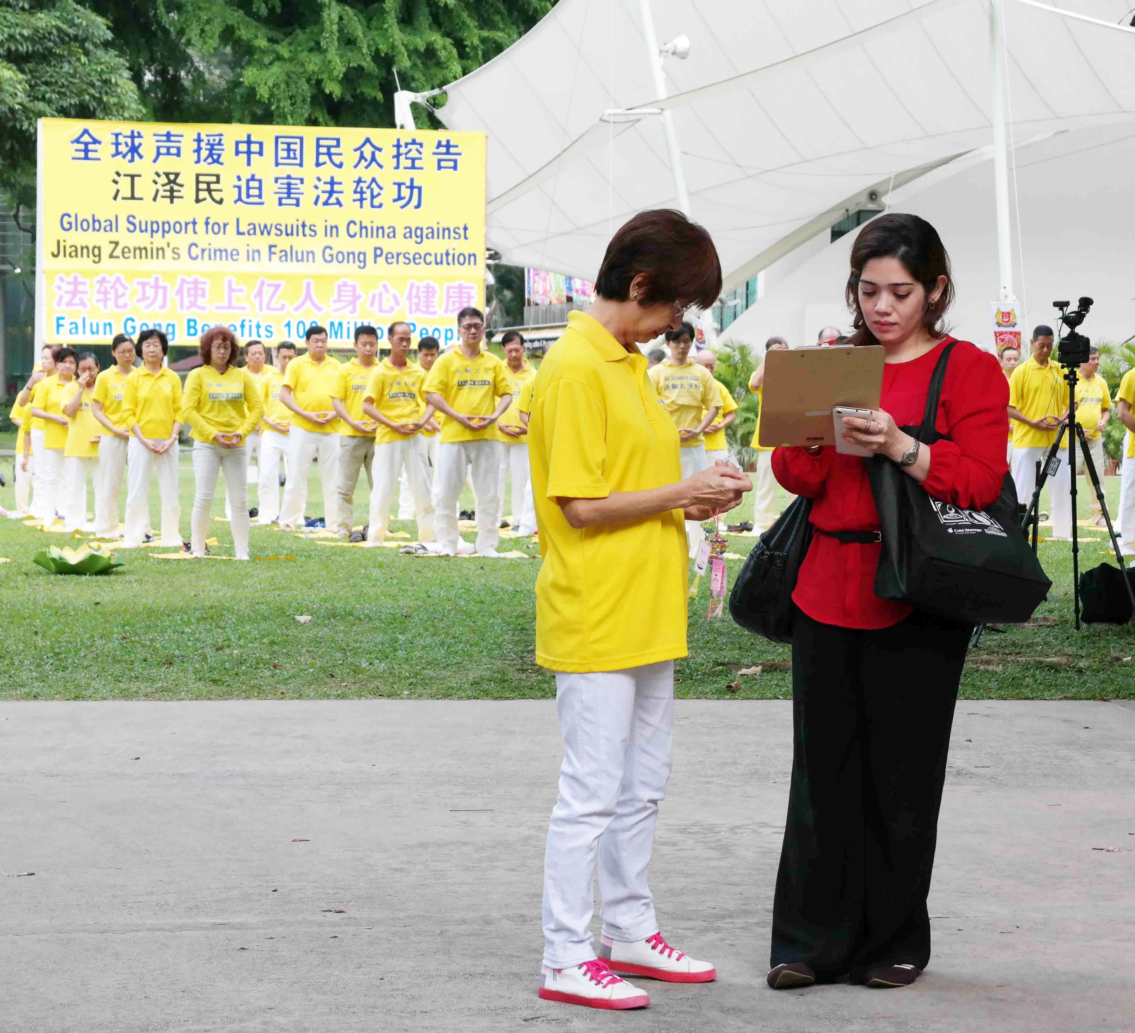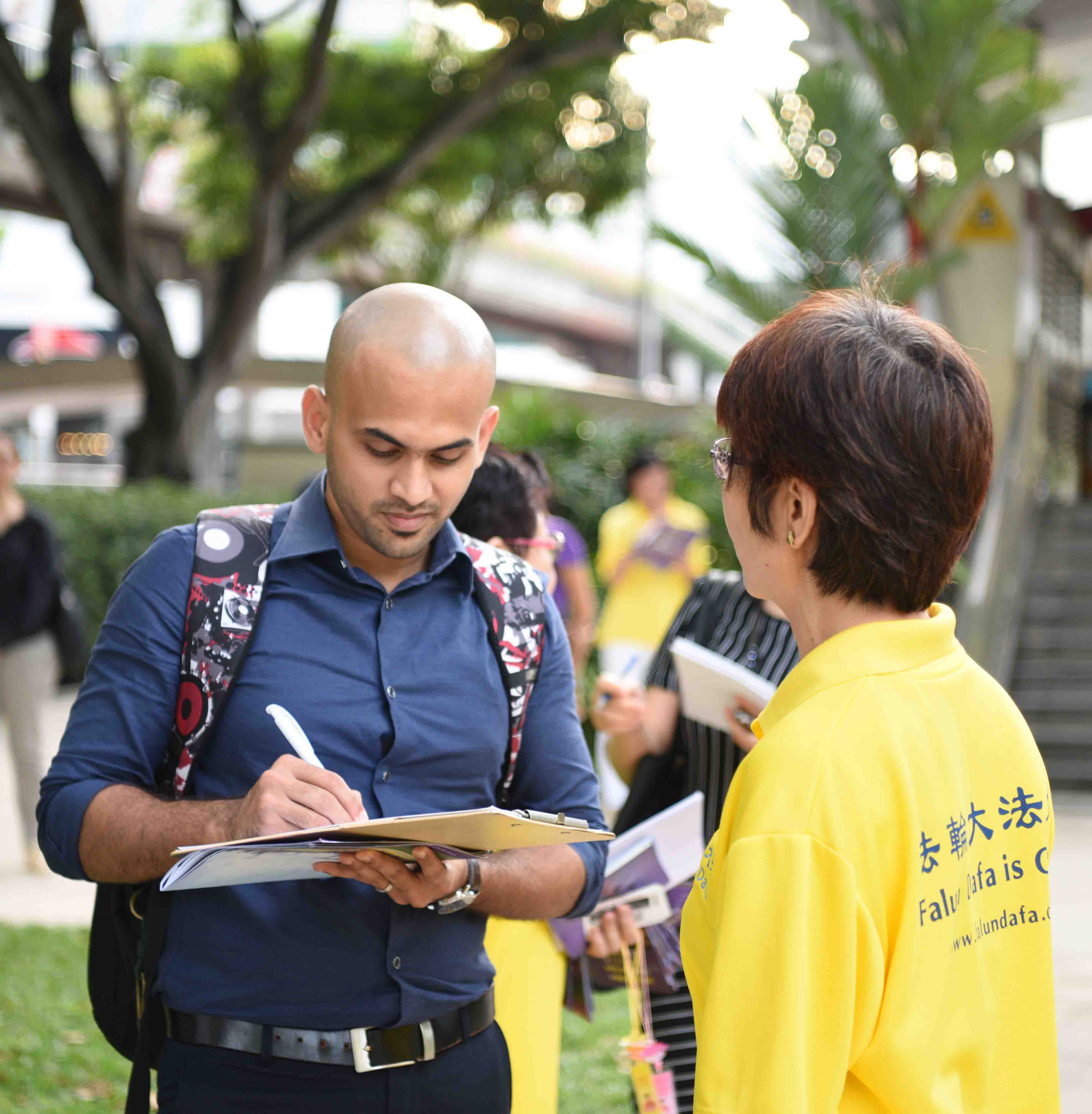 从印度移民新加坡的Archana 小姐就在芳林公园附近工作,多次看到过学员们举办的活动。几个月前,她曾拿了一份真相资料回去阅读,中共活摘器官等罪行让她感到震惊和难过,所以这次她毫不犹豫地签上名字。