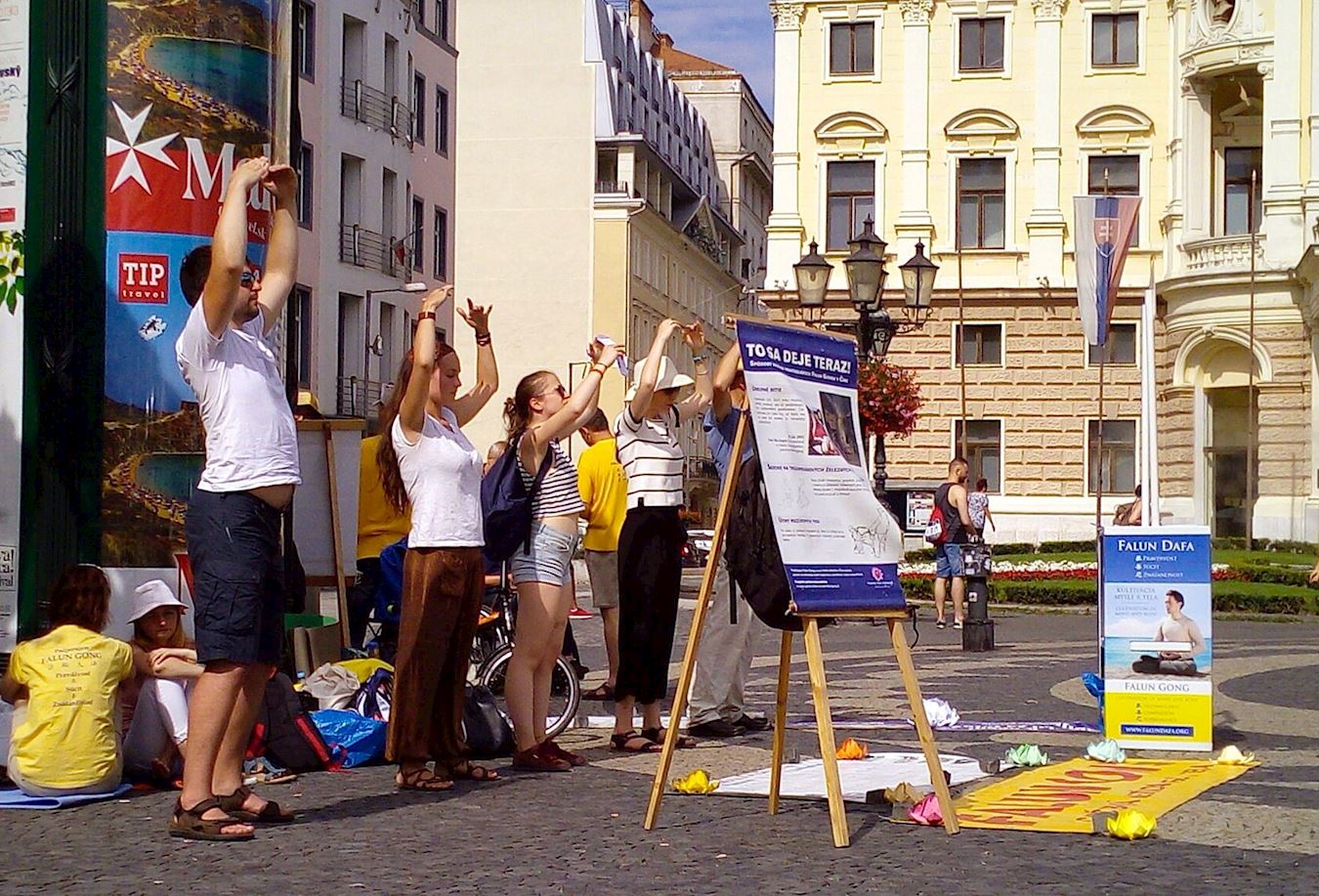 这群年轻人后来听完学员讲述的法轮功修炼者在中国大陆无辜遭迫害的真相后,震惊不已,几乎不敢相信这样残酷的事情正在发生着。随即他们个个来到征签台前签名支持法轮功反迫害。他们还要在斯洛伐克逗留几天,那位学功的女孩希望离开这个城市之前再一次参与集体炼功,请法轮功学员帮她纠正学功动作。