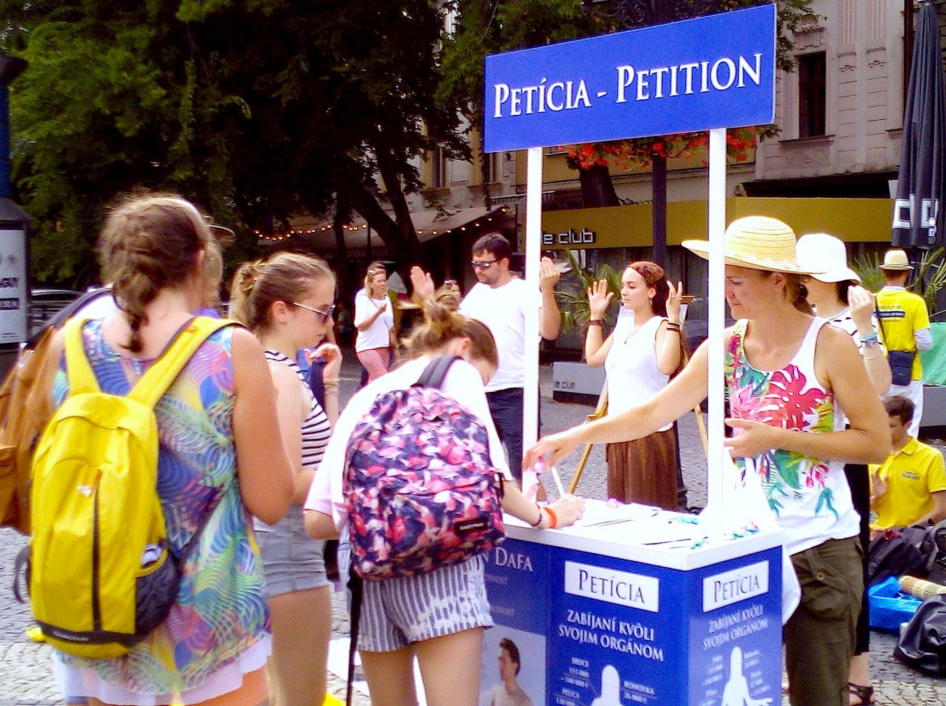 几个斯洛伐克青年,接到学员递过来的传单后,还没读完就议论上了:“这是什么事儿?也太离谱了,强行活摘器官?在中国吗?”学员答道:“是在共产党统治的中国大陆发生的事情。”他们立即说:“哇!共产党?走!我们签名去。”一行四位都在请愿书上签字表态反活摘。