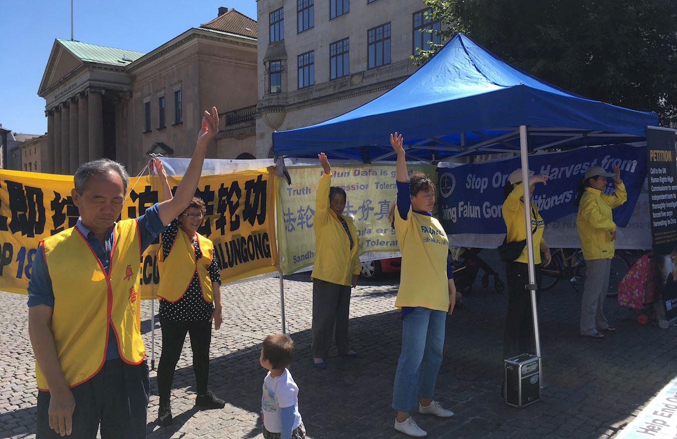 七月二十日学员们再次举办抗议活动。那天是工作日,学员们聚集到中共大使馆前举行了抗议活动。学员们拉起了横幅,中英文写着“停止迫害法轮功”。到场的学员静静地炼着法轮功五套功法,学员善良和平的理念向民众展示法轮大法的美好。“此处无声胜有声”,丹麦的法轮功学员从二零零二年四月年开始每天都到中共驻丹麦大使馆和平抗议,至今已有十五个年头。风风雨雨中把法轮大法的真善忍理念带给丹麦人,同时人们也明白了法轮功被中共迫害的真相。