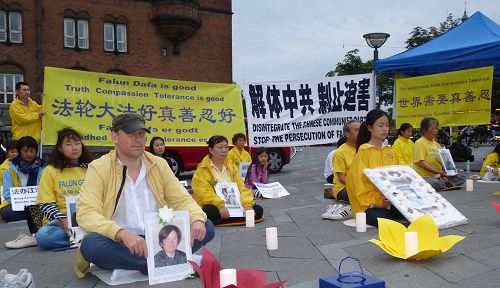 '图3~4:法轮功学员在哥本哈根市政厅广场举办烛光悼念'